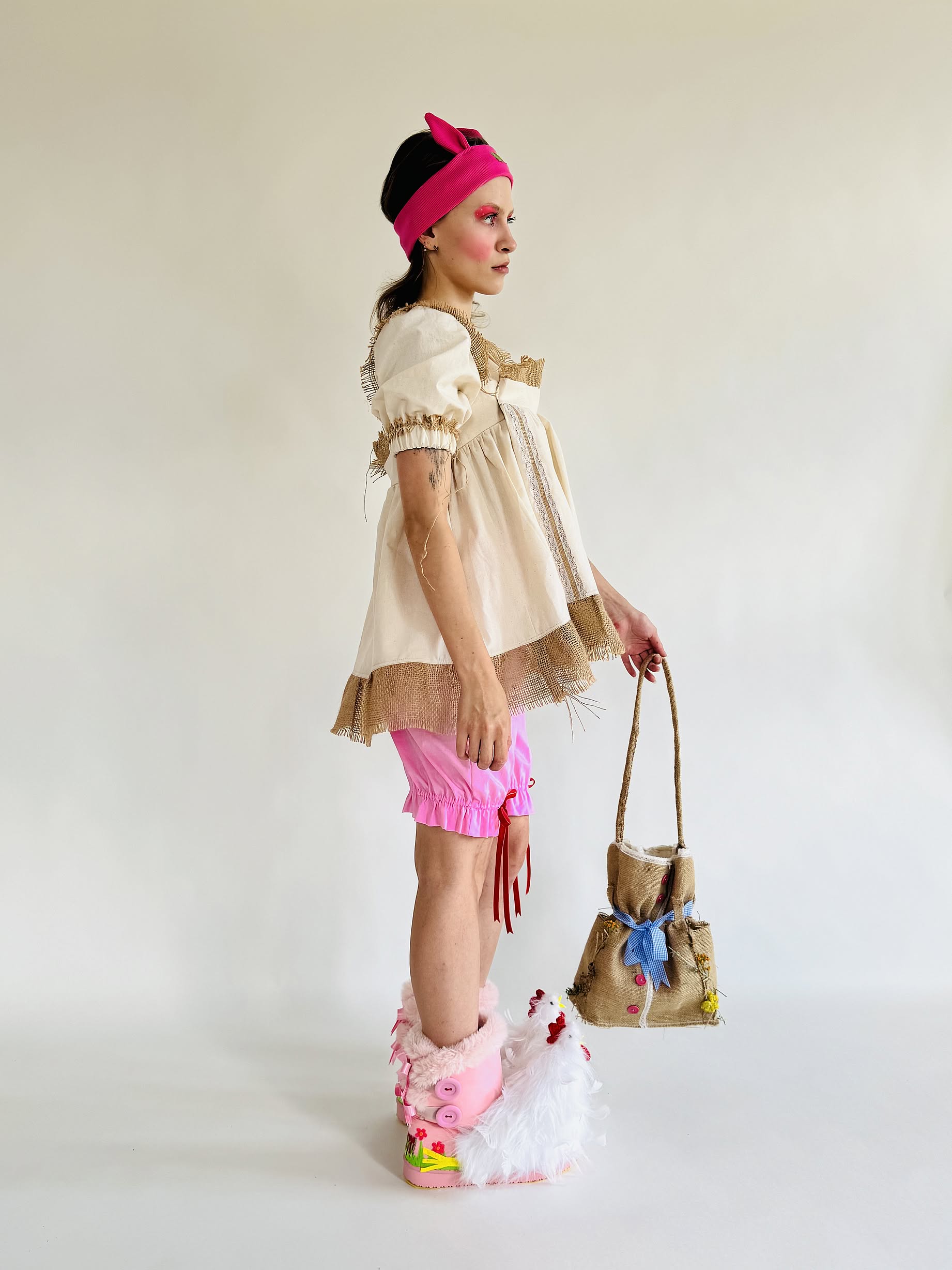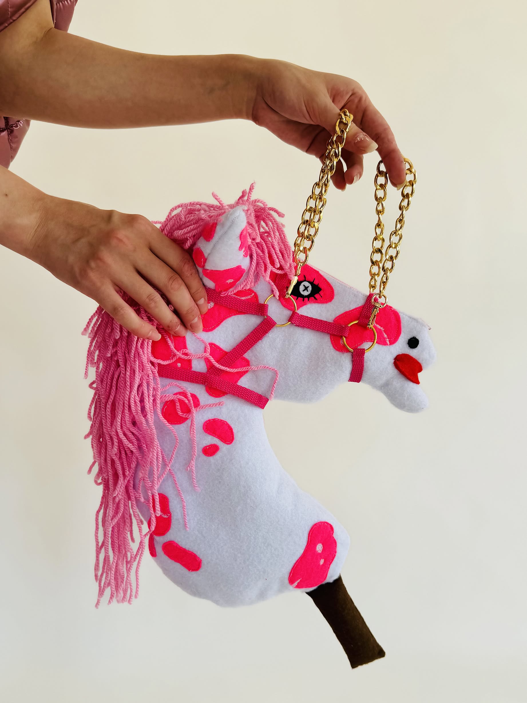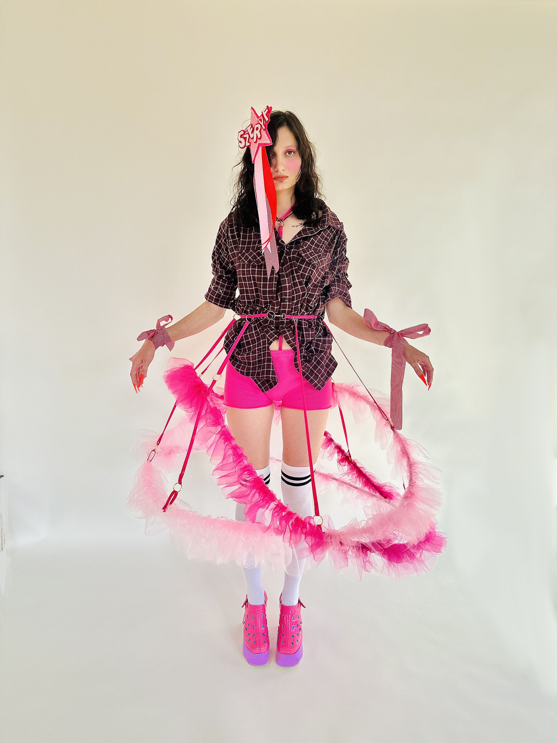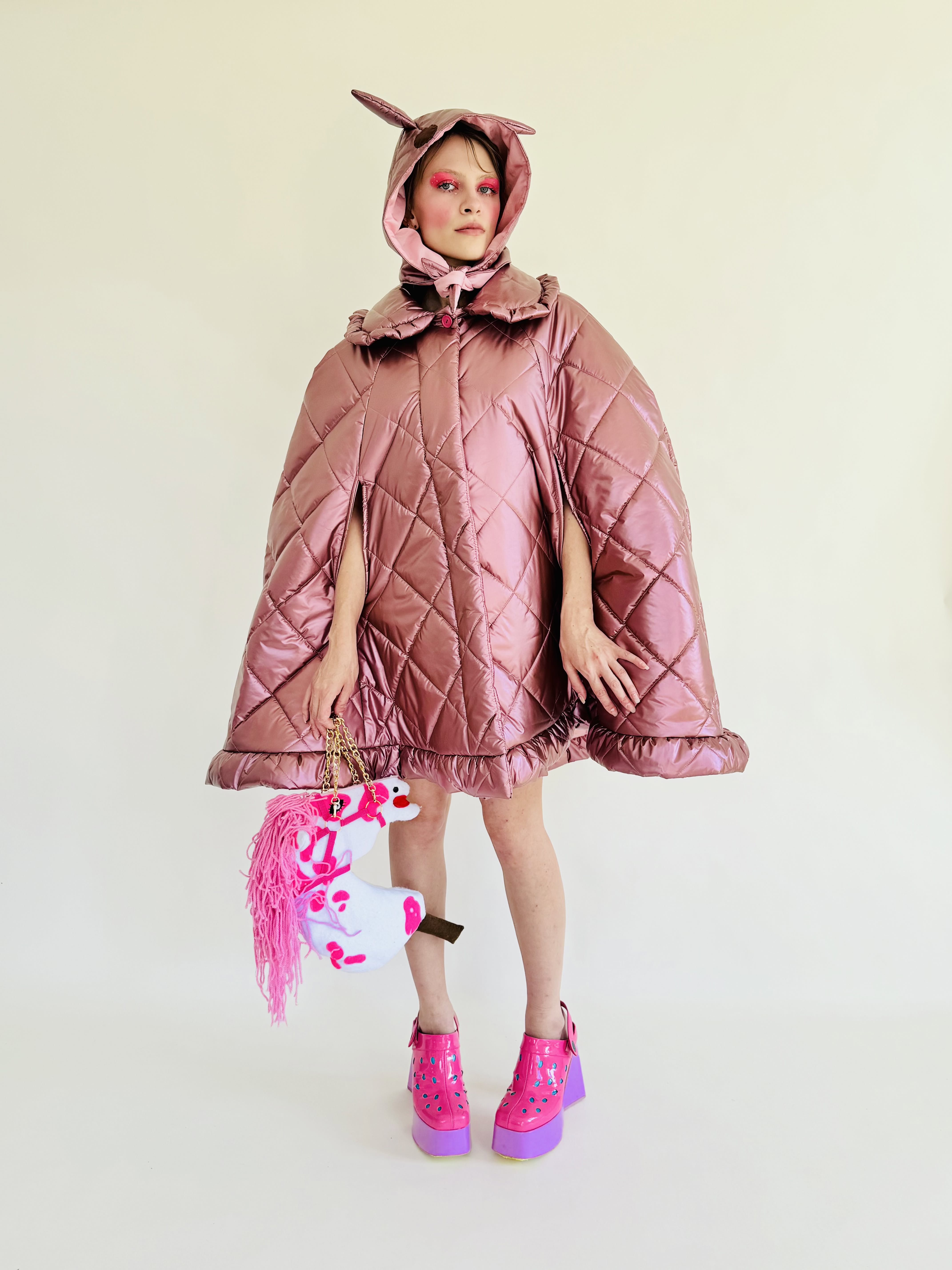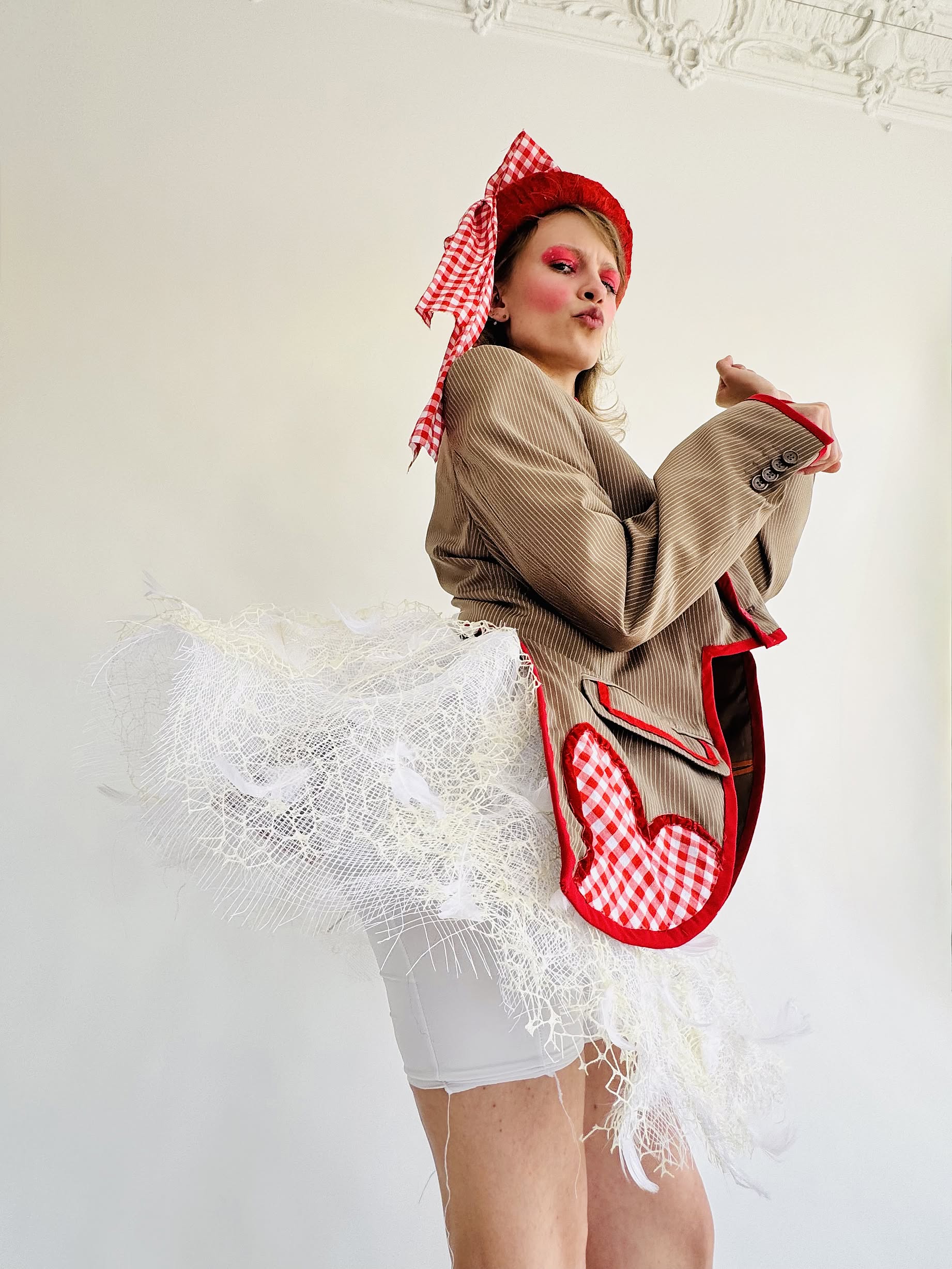Kolekcja „KONIK” czerpie inspiracje ze sportu hobby horsing, przekształcając jego rekwizyty w performatywne elementy stroju. Tradycyjne formy - siodło, derka czy kask - zostają zdekonstruowane i wpisane w teatralny, przeskalowany język mody. Całość łączy humor i groteskę z refleksją nad tym, w jaki sposób zabawa może stać się nośnikiem tożsamościowych i społecznych treści.