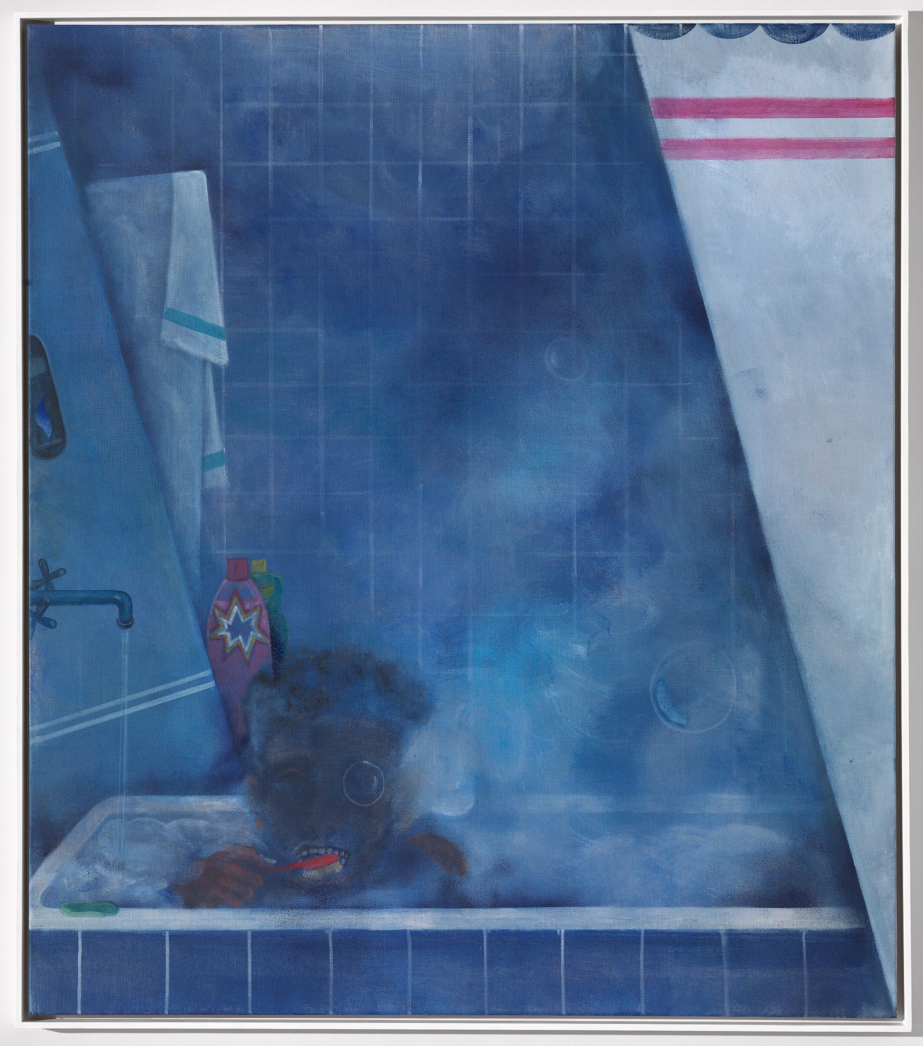 Dla mnie selekcja prac zaprezentowanych w Gdańskiej Galerii Miejskiej stała się okazją do wędrówki po światach wykreowanych przez Kowalskiego i po ich pojedynczych elementach. Obraz „Łazienka”, jeden z niewielu nazwanych, utrzymany w przydymionej, niebieskiej kolorystyce, przedstawia niezidentyfikowaną postać, pozbawioną wyraźnych rysów, myjącą zęby w wannie. Praca ta koresponduje na ścianie z innym obrazem, na którym widzimy postać wychylającą się z ramy płótna, z opuszczoną głową, wpatrującą się w przestrzeń rozciągającą się przed nią. Postaci Kowalskiego, na wpół figuratywne, zdają się nie stawiać oporu wobec okoliczności, w jakich zostały umieszczone. Tkwią zawieszone, nie zawsze zdolne do ruchu, w ramach wyznaczonych im przez artystę. Szczególnie sugestywne są prace przedstawiające ząb wypełniony nie miazgą, lecz wytworem wyobraźni. Zamiast znanych z dziecięcych rysunków bakterii i ubytków pojawia się tam postać złożona w pozycji embrionalnej, z podciągniętymi kolanami, tkwiąca wewnątrz wyrastającego z zadbanego dziąsła kła. Ubrana jest w coś na kształt piżamy. Co symbolizuje? Nerw? Ból? Bezradność? Z otwartej szczęki, namalowanej na obrazie nieopodal, wyrasta natomiast pocztówka przedstawiająca niby-podwodne królestwo. Czy to fantazja o podróży, która mogłaby wydarzyć się wewnątrz ludzkiego ciała? Ta szczęka jest niemal idealna: równe zęby, krwistoczerwona jama ustna, bez widocznych ubytków i zakłóceń. Na tym tle szczególnie interesująco wypadają dwie prace oparte na zestawieniu rysunku i malarstwa na płótnie, które można czytać jako mikroskopijne studia napięć obecnych w całej wystawie. W jednej z nich delikatny, szkicowy zapis kilku postaci zostaje niemal wessany przez gęstą, przyciemnioną materię obrazu. Działa ona jak lepka substancja pamięci – jednocześnie konserwuje i zniekształca przedstawienie. Figury są ledwie uchwytne, zawieszone pomiędzy byciem a znikaniem, podobnie jak bohaterowie innych prac z tego okresu, niezdolni do wyjścia poza narzucone im ramy.