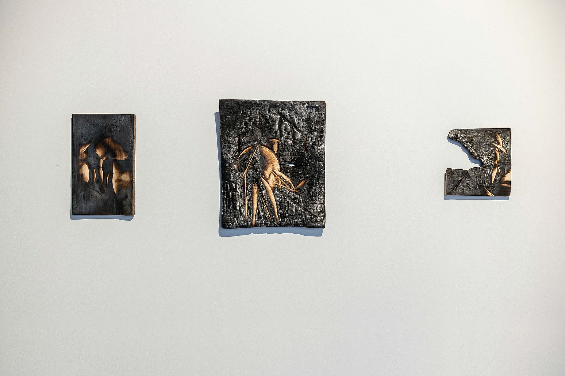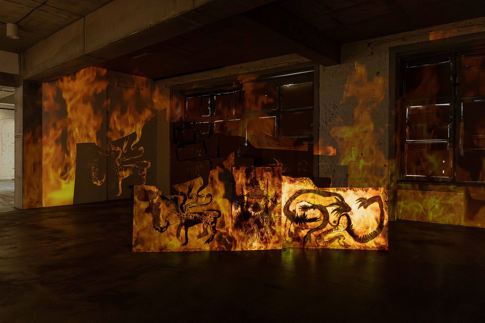W monochromatycznej, pełnej szarości i brązów wystawie najmocniejszym akcentem wizualnym jest z pewnością instalacja Aleksandry Nenko „If the Wall Should Ever Fall, All the Fires Will Go Out”, umieszczona w pierwszej sali na wejściu. Kuratorka w opisie przywołuje skojarzenia z płonącymi barykadami – praca ma postać trzech blaszanych ekranów z na wpół ażurowymi przedstawieniami wielogłowej hydry, fantastycznej konstrukcji z okiem opatrzności pośrodku i stworzenia przypominającego węża, na które rzucona jest projekcja płomieni, przenikająca częściowo z ekranów na ścianę za nimi. Niemal automatycznie pojawia się skojarzenie z ołtarzem, a także jaskinią platońską, Batko za autorką pracy pisze natomiast wprost, że „praca odnosi się do masowych protestów w obronie praw kobiet, które rozpoczęły się w 2020 roku.” W tym kontekście szczególnie ciekawe wydaje mi się tło, na które rzucane są cienie z ekranów, czyli posklejane kartony zasłaniające okna, które przywodzą na myśl rewersy kartonowych transparentów z marszów i protestów. Aleksandra Nenko pisze o swoich ekranach właśnie jako o „animowanych transparentach”. Nie sposób też nie wspomnieć o warstwie dźwiękowej projekcji Nenko – to jednostajny dźwięk płonącego, trzaskającego ognia, który szczególnie dobrze łączy się z prezentowanymi w dalszej części wystawy czterema pirografiami na deskach Rafała Bujnowskiego.