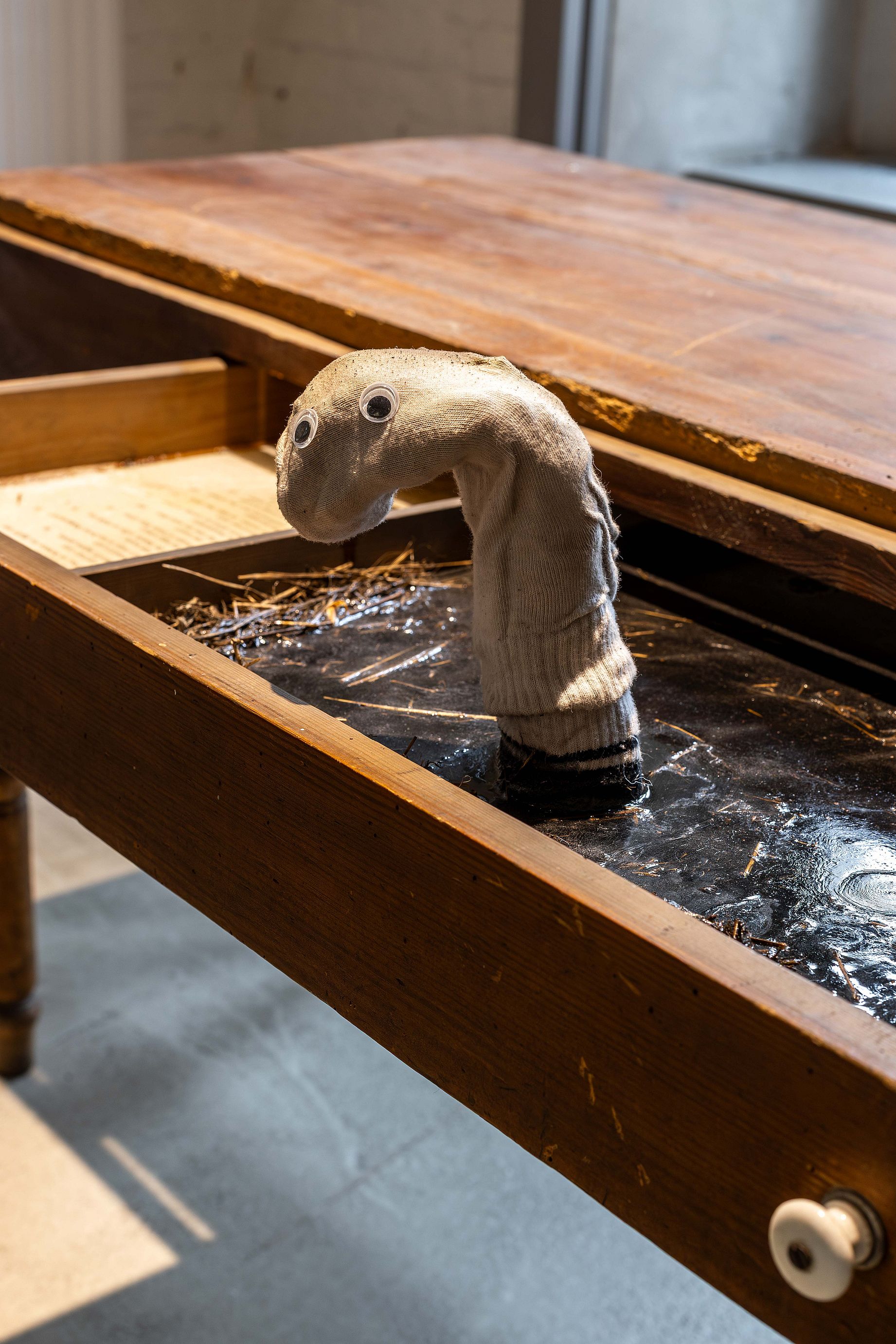 Ci z odbiorców, którzy w związku z deklaracją kuratorki dotyczącą odpadkowej natury wystawy, mającej odzwierciedlać stan rzeczywistości w ogóle, spodziewają się na niej „śmieciowej estetyki”, będą zaskoczeni. Zamiast efektu przytłoczenia i wielości, całość jest mocno wyciszona i minimalistyczna, a wrażenie które pozostawiła na mnie było niemal relaksacyjne. Część dzieł to objets trouvés, rzeczy z własną historią, takie jak szuflada z pracy „Szczęście dla wszystkich i stara szuflada” Pawła Marcinka, którą artysta znalazł w piwnicy rodzinnego domu, ewokująca dwa znaczenia szczęścia: jako farta, powodzenia i jako długotrwałego spełnienia. Do tej kategorii zalicza się również stare biurko i skarpetka, dwa główne komponenty dzieła „Leni Riefenstahl Goes to Africa (And Loves It!)” autorstwa Andreei Anghel, w połączeniu ze sobą przywołujące nie tylko powojenne losy niemieckiej reżyserki i jej pracę w Sudanie, ale też dziedzictwo kolonializmu i kontekst historii budynku gdzie zlokalizowana jest pracownia artystki.