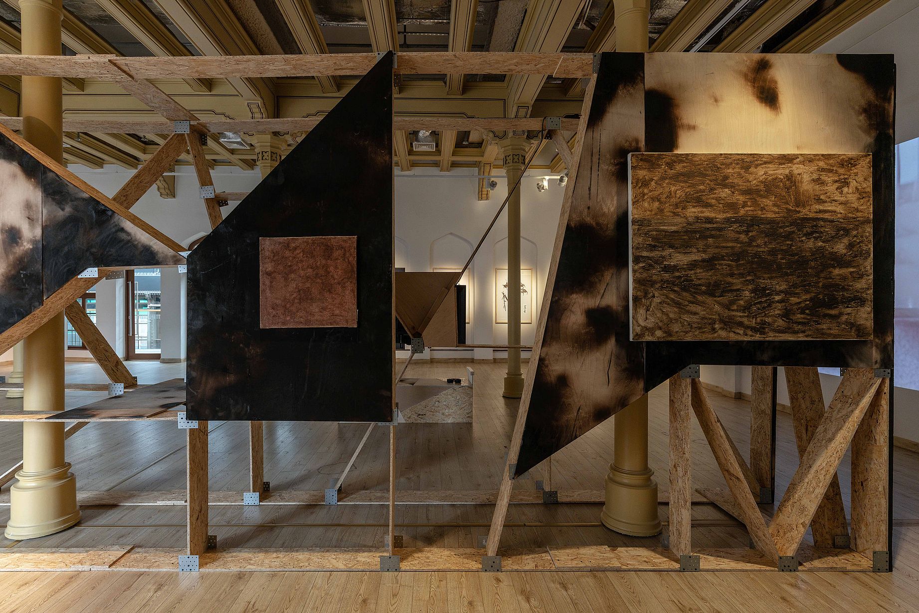 Gdy opowiadałam o tych pracach Agacie Woźniczce, która jest autorką architektury wystawy zapytała mnie o nadzieję na odnowę krajobrazu. Zaproponowana przez BudCud konstrukcja drewniana opalana jest ogniem, który z jednej strony ma siłę niszczącą, z drugiej jednak w naszej kulturze - polskiej czy ukraińskiej, wiąże się z praktyką wypalania traw, hartowania ziemi. Na wystawie pojawia się też wiersz Wasyla Stusa, zakomponowany przez Antona Sayenkę , który odnosi się do praktyki niszczenia, przemijania, do siły hartowania. Ogień objawia się tu jako rodzaj nadziei, siły, która odnawia. Drewniane konstrukcje, tworzące architekturę wystawy przypominają praktykę odbudowy, związaną z przemianami, które mają miejsce w Ukrainie. Oddają też tymczasowość i niepewność w jakiej znalazła się sztuka.