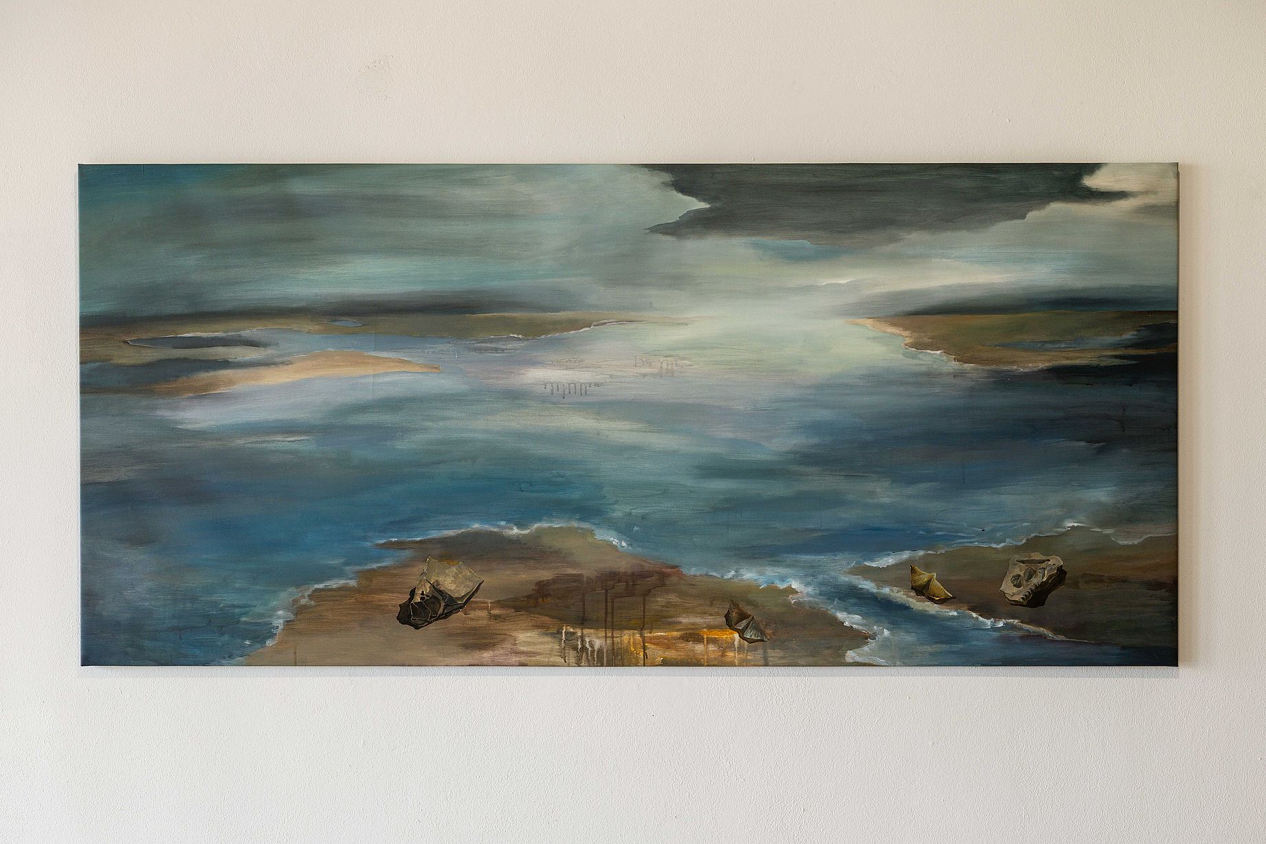 Drugą część wystawy otwiera horyzont namalowany przez Antona Saenko, mglisty, jakby wyjęty ze snu, bardziej abstrakcyjny. Artysta, który pochodzi z okupowanego obecnie obwodu Sumskiego, odnosi się do wspomnień z terenów utraconych, poddaje refleksji obecną sytuację – przesuwającą się linię frontu. Prace wielu twórców wracają do ich wspomnień bliskości z naturą na utraconych dziś obszarach Ukrainy. Tak jest w przypadku prac Kariny Synistii czy Kateryny Alinyk. W obliczu wojny spacer po lesie, zbieranie grzybów czy kąpiel latem w jeziorze mogą okazać się śmiertelnie niebezpieczne. Na wystawie starałam się operować zmianą perspektyw. Obok horyzontów widzimy także obraz z mikroskopu czy próbę znalezienia właściwego kadru obrazującego skutki wysadzenia przez Rosjan tamy na Dnieprze w pracach Yany Kononovej. Razem z Kateryną Alinnyk kierujemy wzrok pod ziemię, gdzie korzenie roślin oplatają granaty. Na ziemi spotykamy warzywa rozsypane jakby po zbiorach lub wybuchu bomby. W tym kontekście termin martwa natura nabiera nowego wymiaru. Przygotowując wystawę czytałam książkę ukraińskiej badaczki Daryi Tsymbalyuk na temat ekobójstwa. Pisze ona o ziemi, która w tradycji ukraińskiej ma wyjątkowe znaczenie, ponieważ najpierw karmi – daje życie, a później kończy żywot człowieka. Wielowymiarowość tego słowa odnoszę do pracy Nikity Kadana, w której z widoku pola namalowanego węglem wydobywa się cień ludzkiej ofiary wojny.