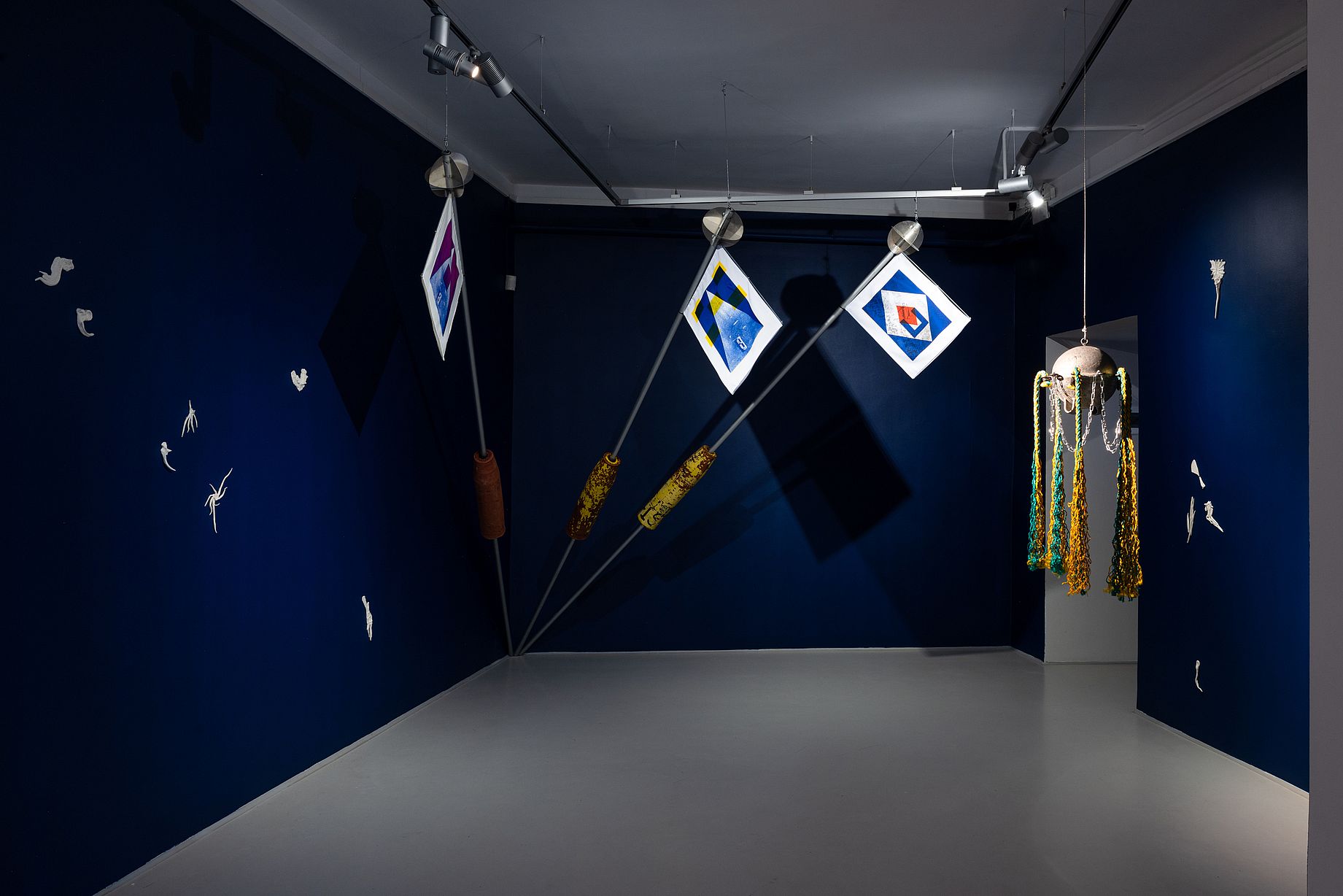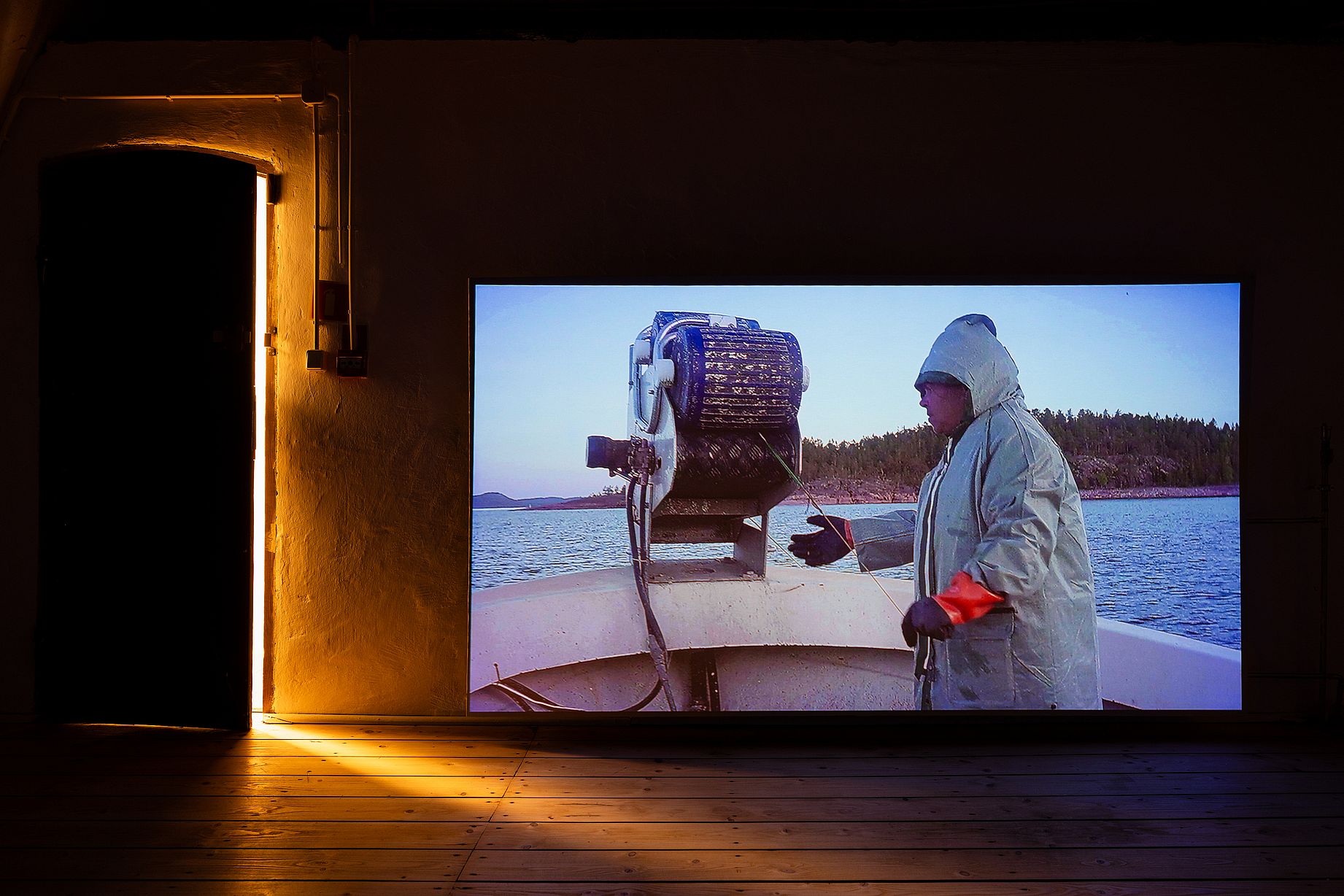 R.D.: Słusznie wskazujesz na tę baśniowość i obecne na wystawie mitologiczne wątki, które przenoszą nas w jakiś inny obszar skojarzeń. Jest przynajmniej kilka prac, które proponują tego rodzaju narrację. Film „Ryba” Karoliny Breguły przypomina animację poklatkową i opowiada o bardzo realnym problemie Bałtyku, ale i wielu innych wód, związanym z zanikaniem tradycyjnego rybołówstwa. Jedną z przyczyn są przemysłowe połowy i związane z nimi stopniowe wymieranie ryb i innych gatunków. W sposób baśniowy, ale bardzo krytycznie patrzy też na traktowanie Bałtyku jako zasobu Blanka Byrwa. Pracuje z biomateriałami, wyławia glony i tworzy z nich coś, co może zastąpić plastik.