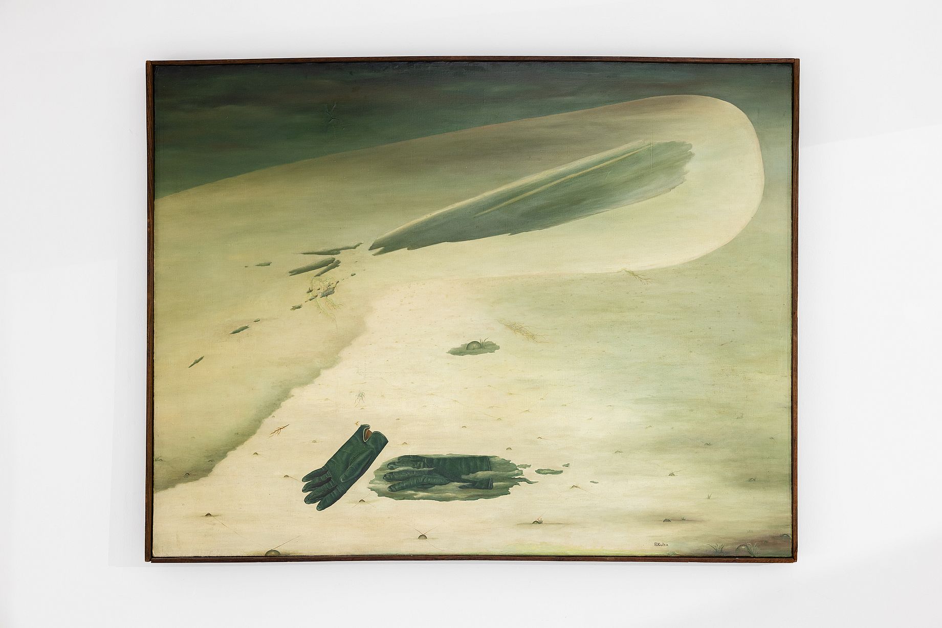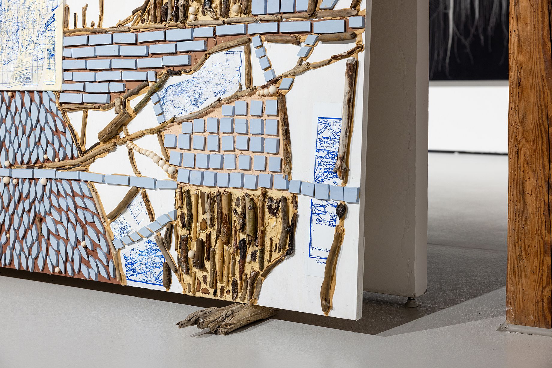 A.K.: I to jest problematyczny moment. Takie rozważania są obecne w pracach Theresy Weber, która podejmuje wątki karaibskie, w kontekście żywiołu natury, huraganu, sztormu, jako tej sprawczości. Huragan Melissa, jaki ostatnio dotknął wybrzeża Jamajki, wyrządził ogromne szkody na morzach i na lądzie. Więc rzeczywiście woda nie zawsze jest sprzymierzeńcem. I to odzwierciedla technika kolażu, której używa Weber, która może budzić skojarzenia z rozbiciem, zranieniem, erozją. Zranienia odnajdziemy też w obrazie Elżbiety Kulki z 1983 roku pod tytułem „Wyzwanie”, w którym artystka-marynistka namalowała dno Bałtyku. To przykład przedstawienia wody nie jako samej cieczy, ale całego otoczenia. Obraz Kulki uległ częściowemu zniszczeniu, miejscami płótno popękało, ale artystka zamiast to naprawić, podkreśliła pęknięte miejsca, domalowując wokół nich szwy. Bałtyk w swojej historii przeszedł wiele zranień w postaci zanieczyszczeń, wraków po II wojnie światowej, odpadów z paliwem w korodujących beczkach.