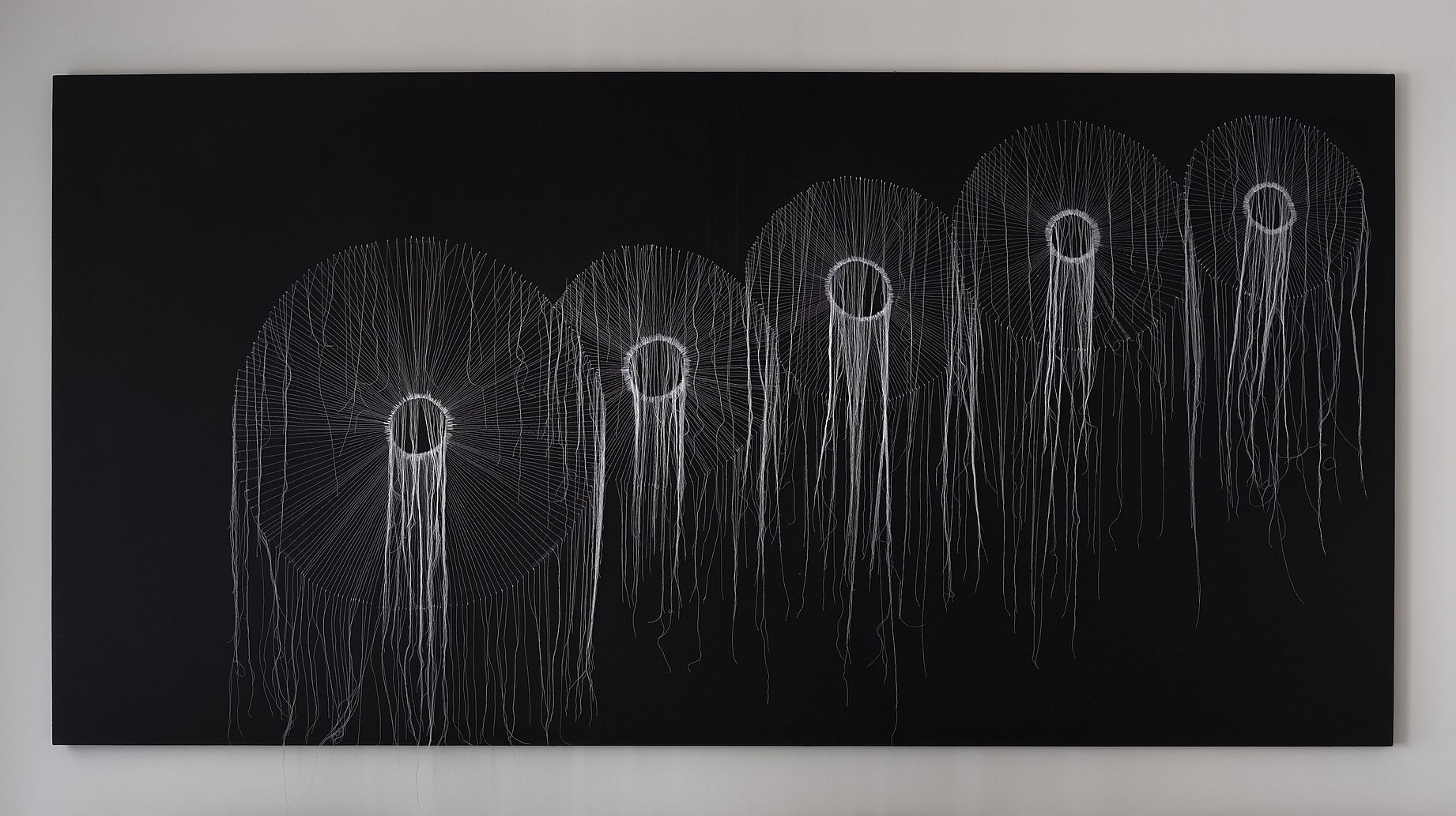 R.D.: Dobrawa Borkała jest artystką, ale i psycholożką. Skupia się na oddechu, a jej prace mają często wymiar medytacyjny. Prezentujemy pracę Dobrawy o tytule „Eternal Dance”, powstałą pod koniec jej studiów w Paryżu. Na czarnym lnie artystka wyszyła białymi nićmi wizerunki meduz Turritopsis dohrnii, układające się we fragment cyklu ich życia. To wyjątkowy gatunek, który ma zdolność pozwalającą im być biologicznie nieśmiertelnymi. W momencie zagrożenia dorosłe ciało potrafi powrócić do larwalnej postaci i może to robić wielokrotnie. Są korporacje, które próbują zbadać tajemnicę życia tych meduz, by wykorzystać ich regeneracyjne zdolności, jednak pozostają one zagadką i pewnie jeszcze długo tak będzie. Przy okazji warto dodać, że możemy się jedynie domyślać w jakiej skali działają największe firmy, które wyzyskują podwodne ekosystemy. Anca i Arnold, o których wspominasz, pracowali nad swoją instalacją w trakcie rezydencji, w pracowni rzeźby i ceramiki Michała Żesławskiego. Elementy ich pracy są wykonane w bardzo specyficznym rodzaju porcelany, który był stosowany w XVIII wieku do tworzenia precyzyjnych form rzeźbiarskich.