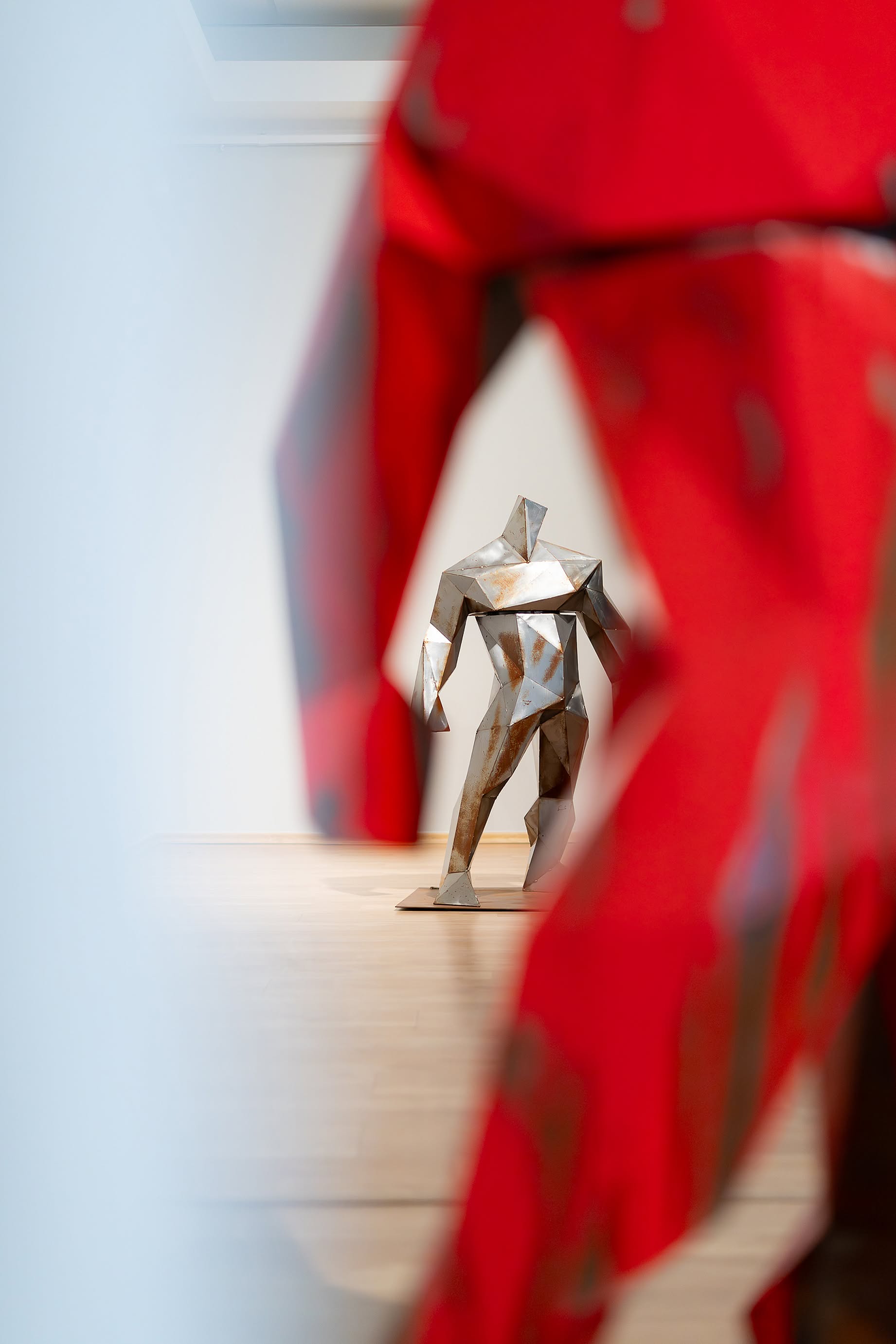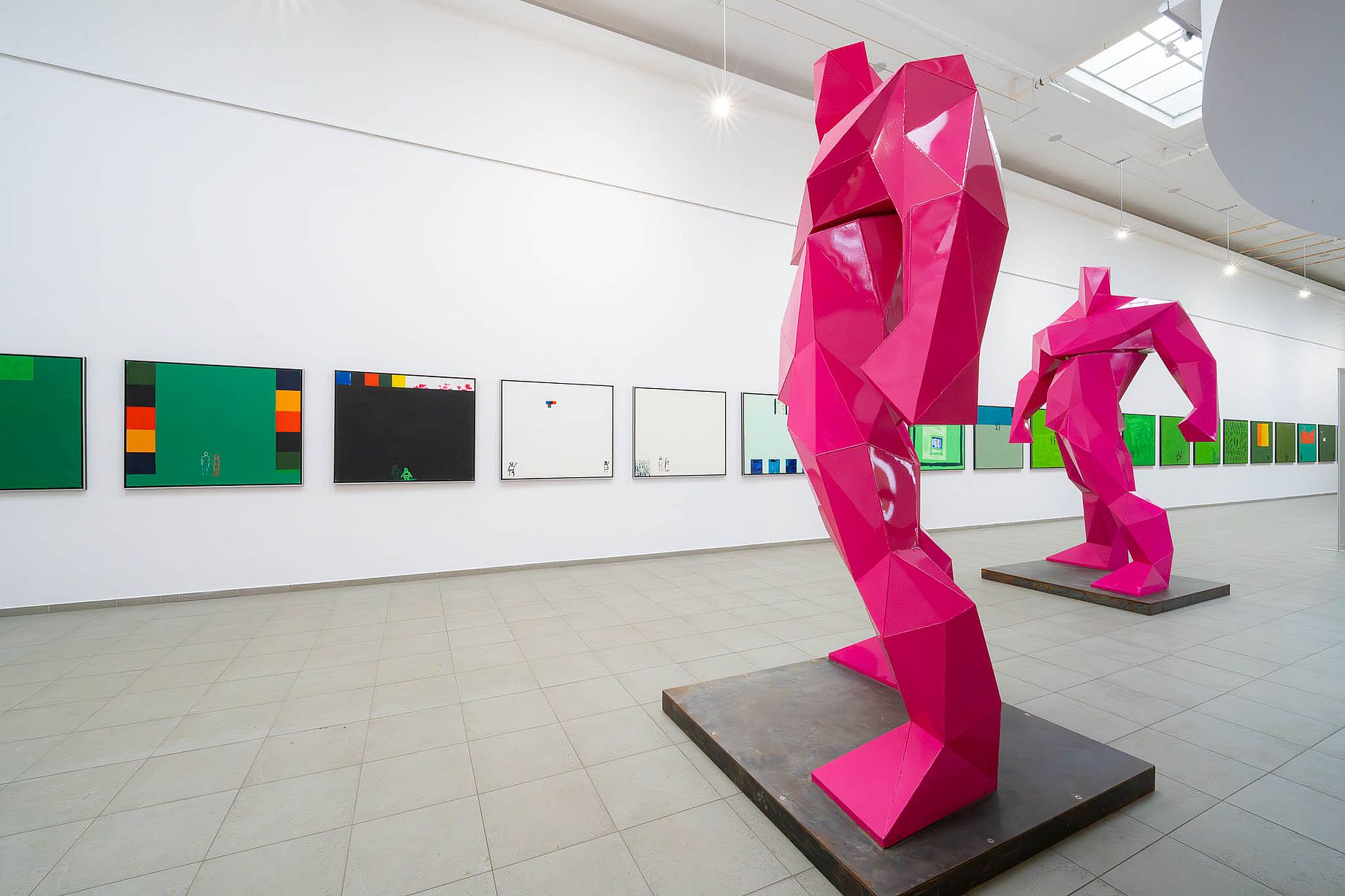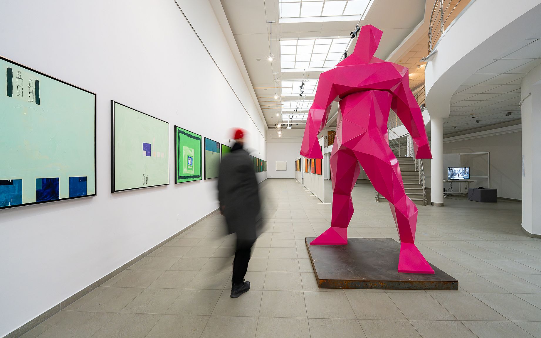 Artur Chrzanowski: Zależało mi, żeby spacer potraktować jako sposób przeżywania świata, a nie tylko temat ilustracyjny. Zestawialiśmy prace o skrajnie różnych temperaturach formalnych: oszczędność i intymność malarstwa Włodzimierza Pawlaka z ostentacją i skalą rzeźb Pawła Orłowskiego. Te dzieła są skrajnie różne, ale może właśnie dlatego budują intrygujący rytm wystawy. W obrazach Pawlaka jest cisza, skrót, notatka – czytamy tę opowieść przechodząc kolejno od obrazu do obrazu, spacerując wzdłuż ekspozycji. U Orłowskiego jest skala i energia, wspomniana „ostentacja” zarówno kształtem jak i kolorem – te rzeźby wchodzą bardzo głośno w przestrzeń wystawy i w percepcję widza. Gry komputerowe natomiast są niejako „pomiędzy”, reprezentują spacer „od środka”, w pierwszej osobie, bo sami musimy go zainicjować, rozpoczynając rozgrywkę. Chciałem, żeby widz odczuł to napięcie nie tylko w głowie, ale i w ciele, bo architektura galerii determinuje do chodzenia, fizycznego przemieszczenia się, wejścia w rytm kroków. Wystawa ma działać trochę jak wytyczona trasa, w której zmieniają się prędkości, natężenie i rejestry percepcji. I stąd taka jej kompozycja.