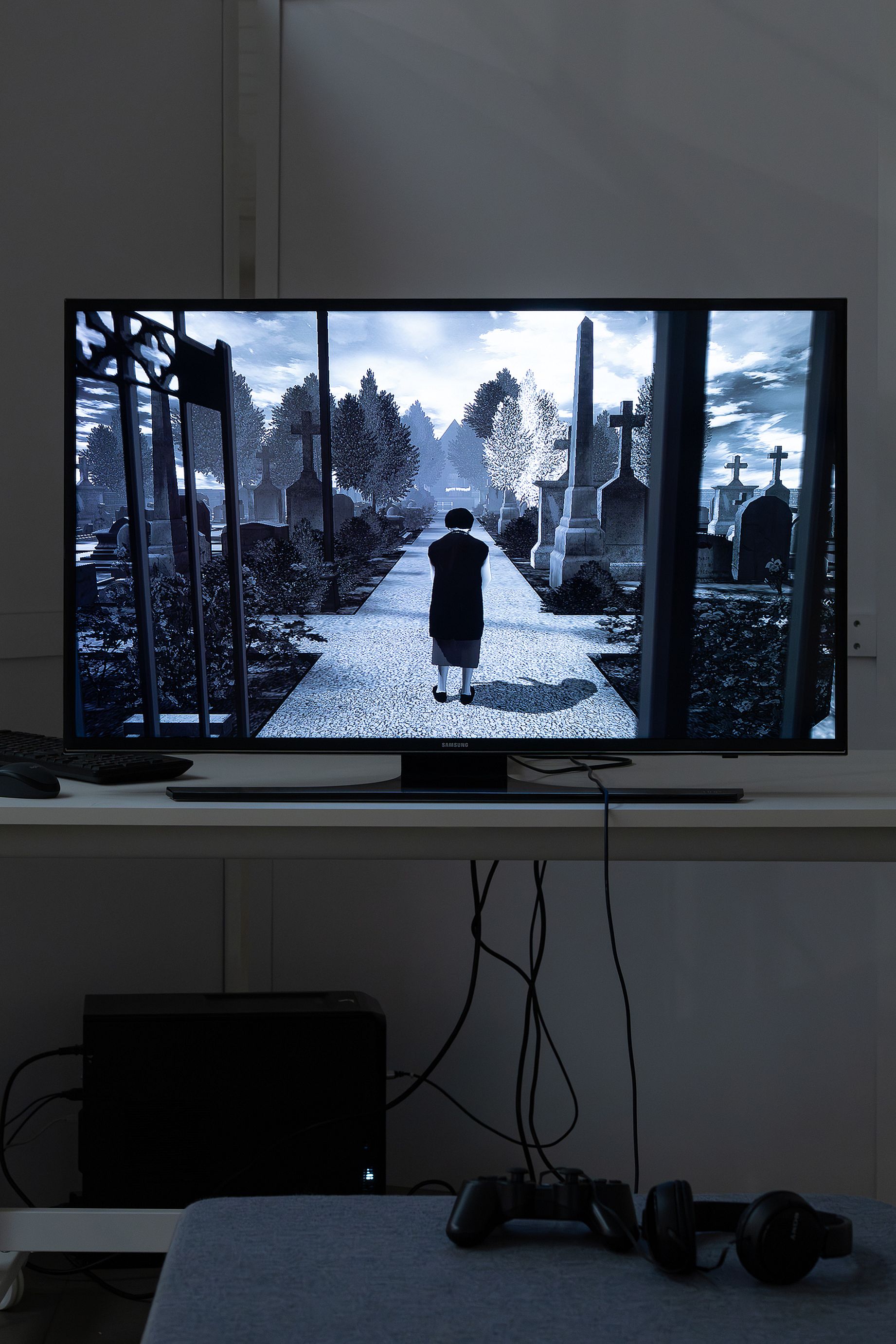 BG: Przy pracy nad sekcją gier ważne były dla mnie koncepcje traktujące chodzenie jako sposób poznawania i zapisywania przestrzeni, szczególnie refleksje Michela de Certeau o retoryce chodzenia. Gatunek walking sims bardzo dobrze wpisują się w takie myślenie, bo w grach takich, jak The Graveyard czy Passage sens nie wynika z rozbudowanej fabuły, tylko z samego aktu przemieszczania się i z ograniczeń, jakie są z nim związane, dlatego ten gatunek wydał mi się szczególnie bliski idei wystawy, w której spacer jest doświadczeniem, a nie tylko motywem.