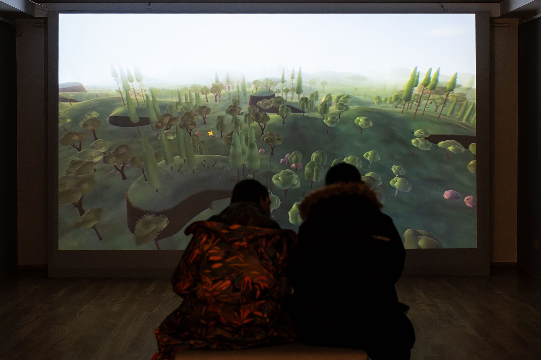 Borys Górski: Z mojej perspektywy, jako osoby odpowiedzialnej za część poświęconą grom typu walking simulator, bardzo ważne było wpisanie doświadczenia spaceru w różne sposoby odbioru przestrzeni. Cała wystawa opiera się na pewnym rytmie przechodzenia między pracami bardzo kameralnymi a realizacjami silnie obecnymi fizycznie, jak rzeźby Pawła Orłowskiego. Sekcja gier wprowadza jeszcze inny tryb kontaktu z pracą, bo przestrzeń cyfrowa zaczyna istnieć dopiero w momencie, kiedy widz decyduje się w nią wejść, więc pojawia się przejście od oglądania do sytuacji, w której trzeba samemu podjąć działanie.