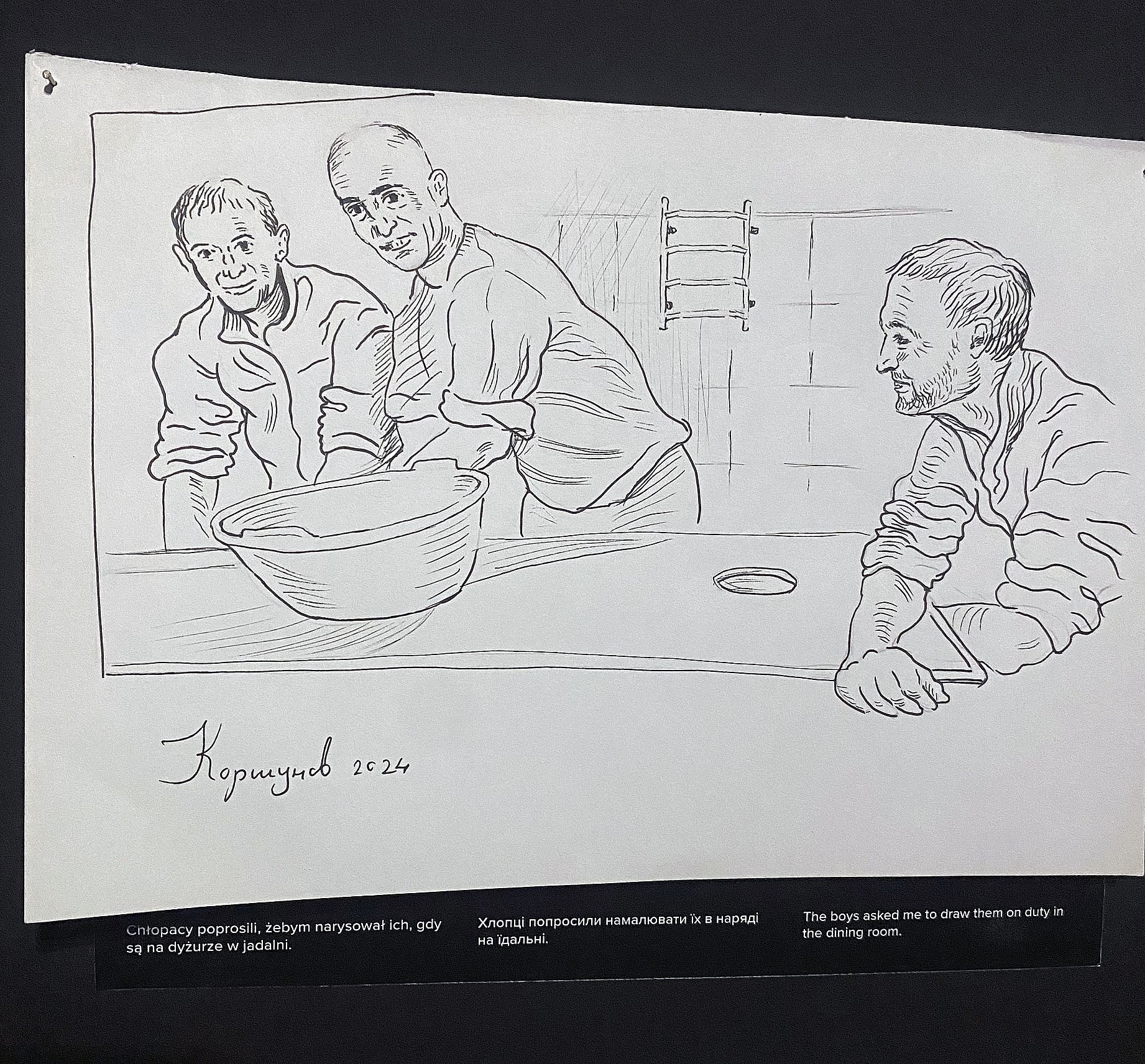 Tym co najbardziej uderza w „Pył leczy” Yevhena Korshunova jest prostota i bezpretensjonalność mikropowieści o towarzyszach z frontu. Intymność tych przestawień mogą wręcz wywołać dyskomfort: artysta pokazuje konkretnych ludzi w miejscu abstrakcyjnego żołnierza, wiernie oddaje ich rysy twarzy i przywołuje charakterystyczne cechy w swoim rysunkowym dzienniku, a ten skromny gest ma wielką siłę. Drugą częścią pracy jest replika schronu, w którym mieszkał. Można tę budowlę, jeszcze czystą, pachnącą świeżym drewnem, potraktować symbolicznie, jako niewinne zaproszenie do wyobrażenia sobie ciągu możliwego dalszego. Postacie z „Pył leczy” zostały zestawione z „Głowami” Antona Saenko, jak sam artysta trafnie określa „po prostu cuchnącymi”, pokracznymi, odrażającymi, nieludzkimi, co tworzy wstrząsający efekt.
