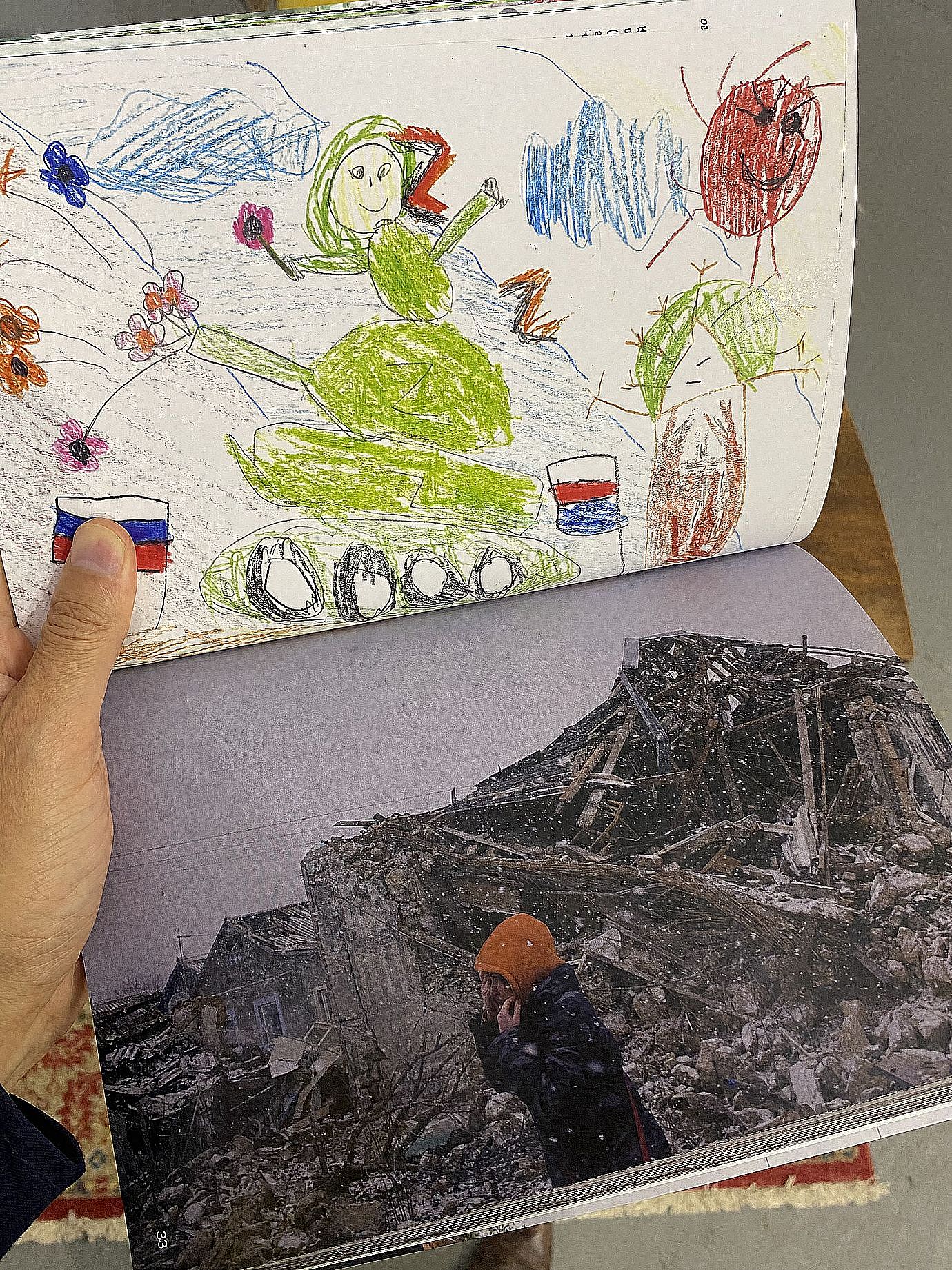 Z tej fascynacji bezlitośnie wytrąca jednak nas niepozorna książeczka. „Lekcje propagandy” Sashy Kurmaza można pobrać wygodnie siadając przytulnym i zapraszającym w kąciku czytelniczym. Niestety, nic miłego cię tam nie czeka. Na stronach publikacji sąsiadują ze sobą rysunki stworzone przez młodzież na propagandowy konkurs „Bohaterowie Rosji i Donbasu” z 2022r. z niepozostawiającymi cienia niedopowiedzenia fotografiami agencji Magnum Photos. Każda taka para – dziecinny obrazek i wstrząsające zdjęcie z wojny w zaskakujący sposób zdają się ze sobą korespondować i chwytają za gardło. Ten akcent jest na wystawie bardzo potrzebny, ponieważ nie pozwala się oddalić od krwawej realności wydarzeń.