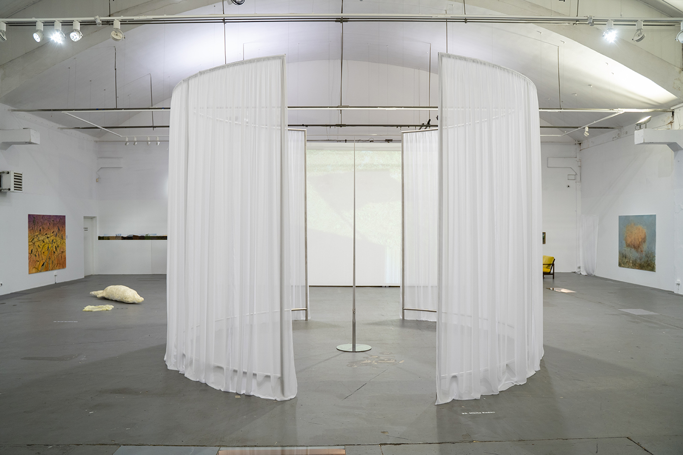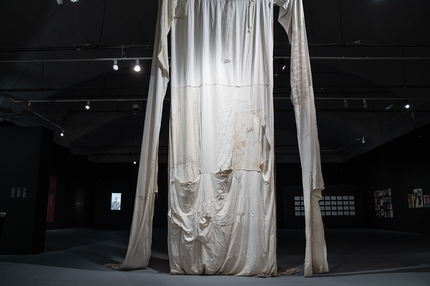 Nad tymi osobistymi opowieściami o wojnie unosi „Mara”, monumentalna, biała suknia Dashy Chechushkovej. Wielowątkowa, imponująca wielkością praca sugeruje coś, co nie powstało na ludzką miarę, a zwiewna tkanina stanowi rodzaj zasłony, całunu, za którym rozpościera się bezmiar emocji. „Mara” przynależy do niewidzialnego wymiaru ofiar, zjaw, które odeszły przedwcześnie i będąc zawieszone między światami próbują ostrzec żywych. Niemal prosto ze świata duchów trafiamy w serce instalacji Nikty Kadana, w nagłą jasność, która prześwituje przez subtelny, okrągły parawan. „Alarm (Syreny i Maszt)” to instalacja, która bawi się percepcją, artysta zrównuje prowadzący ku zagładzie syreni śpiew z syreną alarmową. Głos śpiewaczki operowej jest ułudą, która wypacza ostrzegawczy przekaz i ociera się o tabu, bo czyż nie ma czegoś nieludzko uwodzicielskiego w ocieraniu się o śmierć?