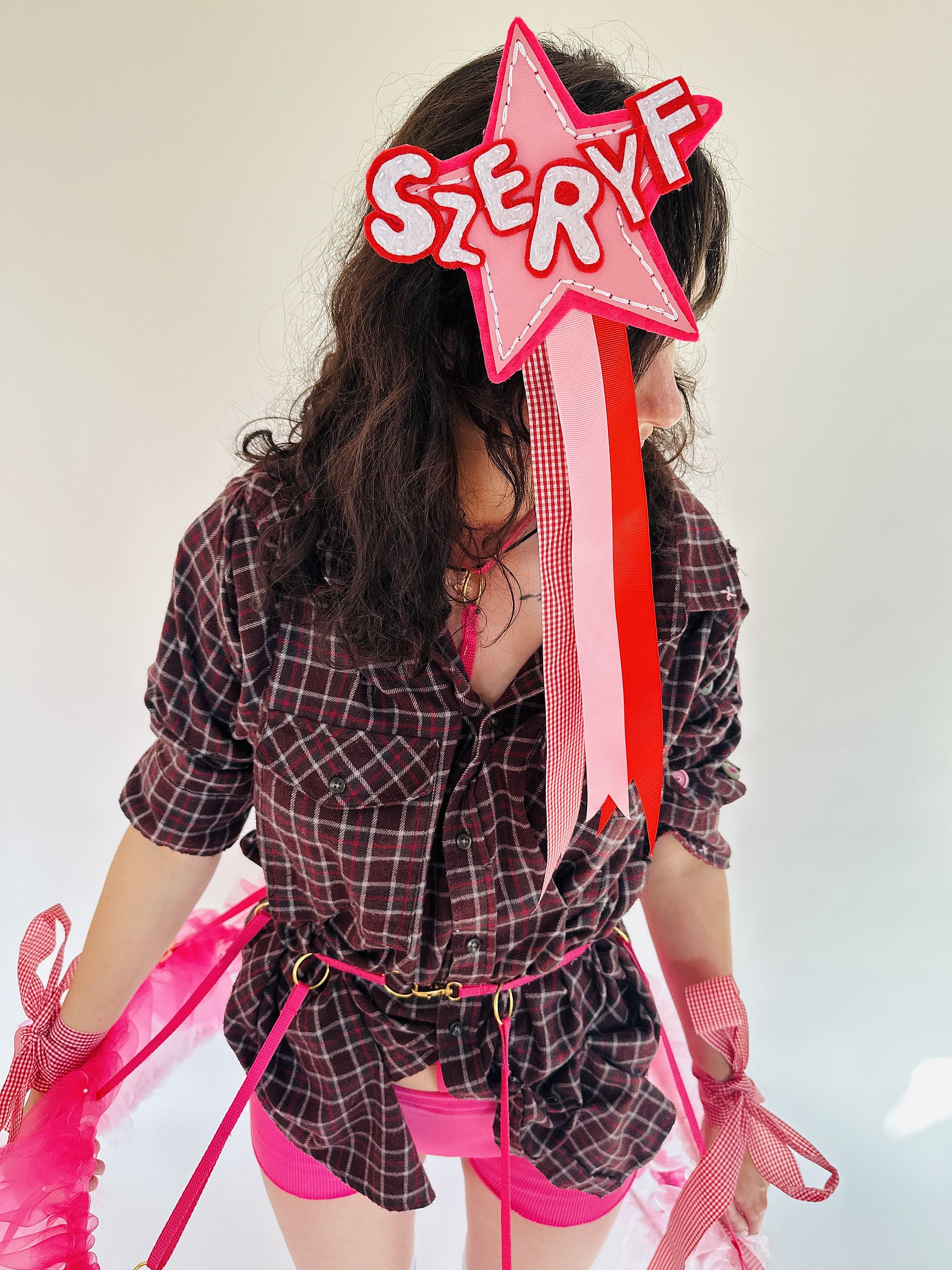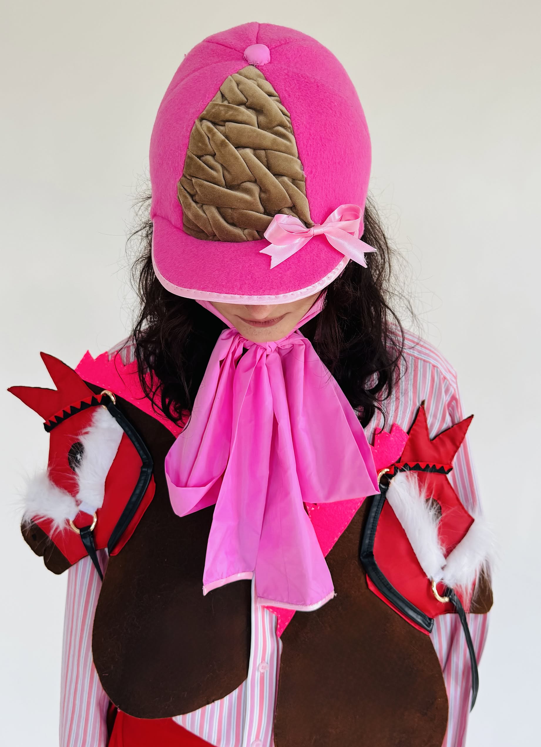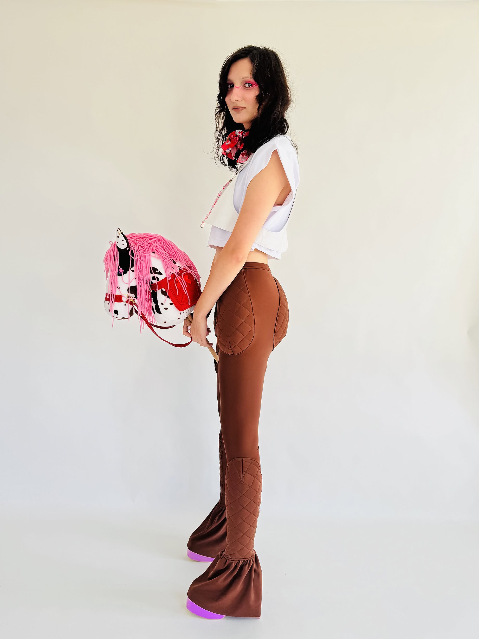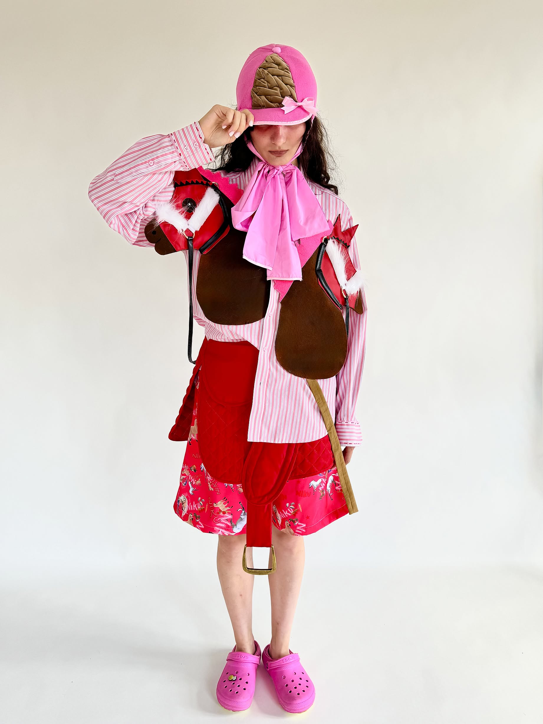 Kolekcja „KONIK” czerpie inspiracje ze sportu hobby horsing, przekształcając jego rekwizyty w performatywne elementy stroju. Tradycyjne formy - siodło, derka czy kask - zostają zdekonstruowane i wpisane w teatralny, przeskalowany język mody. Całość łączy humor i groteskę z refleksją nad tym, w jaki sposób zabawa może stać się nośnikiem tożsamościowych i społecznych treści.