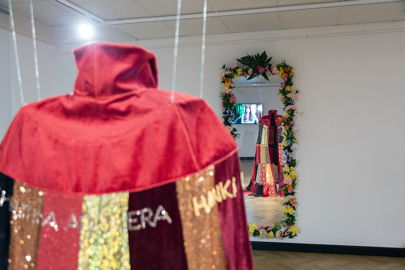 Pamiętacie z baśni pelerynę niewidkę? Kuratorowaną przez Magdalenę Komborską-Łączną wystawę „Smutn* lepszego świata nie zbuduję” zamyka jej przeciwieństwo: peleryna demonstracyjna, która wyławia z tłumu. Nie jest prezentowana na manekinie, tylko na stelażu. Stajesz na postumencie, otulasz się nią i patrzysz w lustro. Kogo widzisz?