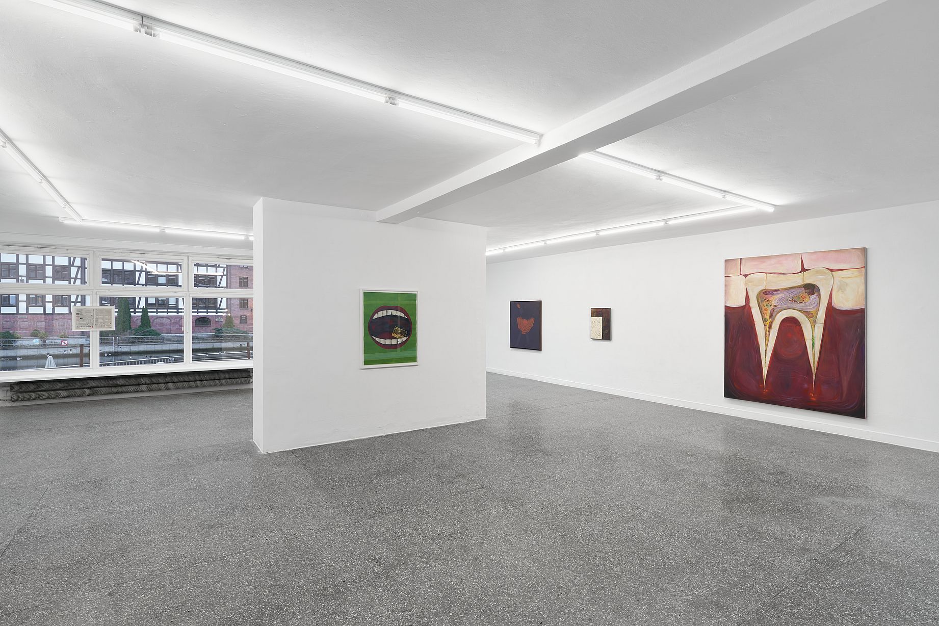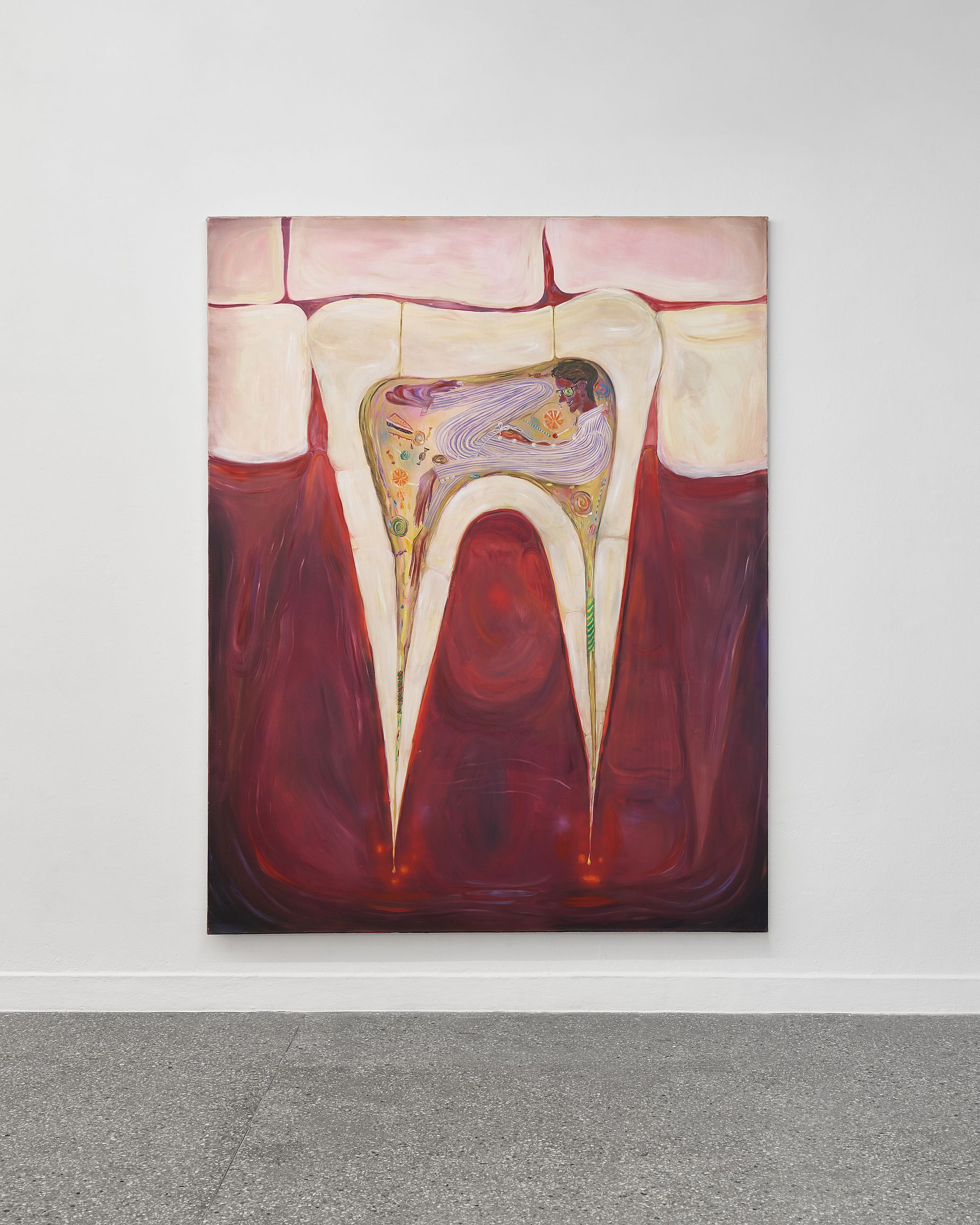 Dla mnie selekcja prac zaprezentowanych w Gdańskiej Galerii Miejskiej stała się okazją do wędrówki po światach wykreowanych przez Kowalskiego i po ich pojedynczych elementach. Obraz „Łazienka”, jeden z niewielu nazwanych, utrzymany w przydymionej, niebieskiej kolorystyce, przedstawia niezidentyfikowaną postać, pozbawioną wyraźnych rysów, myjącą zęby w wannie. Praca ta koresponduje na ścianie z innym obrazem, na którym widzimy postać wychylającą się z ramy płótna, z opuszczoną głową, wpatrującą się w przestrzeń rozciągającą się przed nią. Postaci Kowalskiego, na wpół figuratywne, zdają się nie stawiać oporu wobec okoliczności, w jakich zostały umieszczone. Tkwią zawieszone, nie zawsze zdolne do ruchu, w ramach wyznaczonych im przez artystę. Szczególnie sugestywne są prace przedstawiające ząb wypełniony nie miazgą, lecz wytworem wyobraźni. Zamiast znanych z dziecięcych rysunków bakterii i ubytków pojawia się tam postać złożona w pozycji embrionalnej, z podciągniętymi kolanami, tkwiąca wewnątrz wyrastającego z zadbanego dziąsła kła. Ubrana jest w coś na kształt piżamy. Co symbolizuje? Nerw? Ból? Bezradność? Z otwartej szczęki, namalowanej na obrazie nieopodal, wyrasta natomiast pocztówka przedstawiająca niby-podwodne królestwo. Czy to fantazja o podróży, która mogłaby wydarzyć się wewnątrz ludzkiego ciała? Ta szczęka jest niemal idealna: równe zęby, krwistoczerwona jama ustna, bez widocznych ubytków i zakłóceń. Na tym tle szczególnie interesująco wypadają dwie prace oparte na zestawieniu rysunku i malarstwa na płótnie, które można czytać jako mikroskopijne studia napięć obecnych w całej wystawie. W jednej z nich delikatny, szkicowy zapis kilku postaci zostaje niemal wessany przez gęstą, przyciemnioną materię obrazu. Działa ona jak lepka substancja pamięci – jednocześnie konserwuje i zniekształca przedstawienie. Figury są ledwie uchwytne, zawieszone pomiędzy byciem a znikaniem, podobnie jak bohaterowie innych prac z tego okresu, niezdolni do wyjścia poza narzucone im ramy.