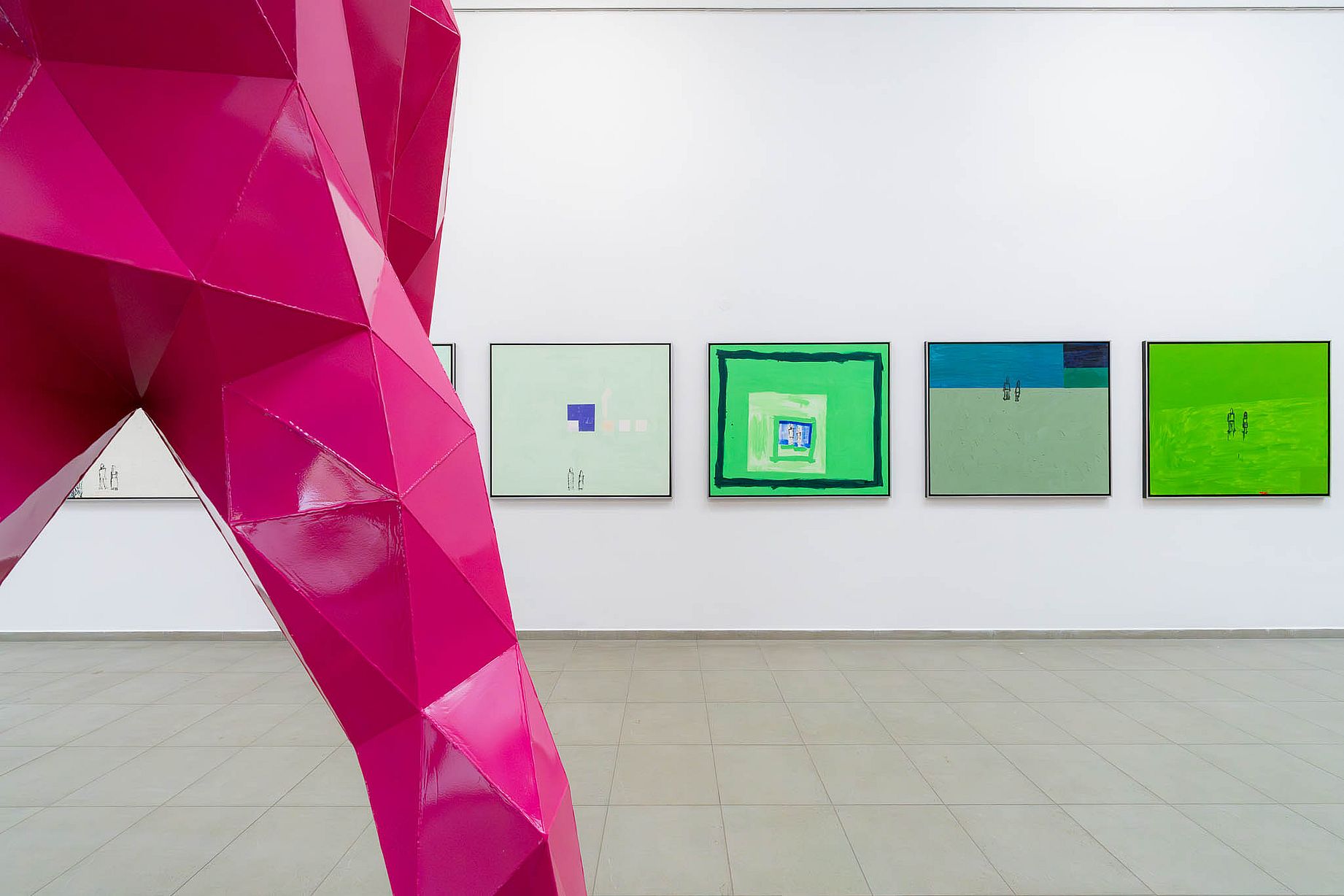 Artur Chrzanowski: Zależało mi, żeby spacer potraktować jako sposób przeżywania świata, a nie tylko temat ilustracyjny. Zestawialiśmy prace o skrajnie różnych temperaturach formalnych: oszczędność i intymność malarstwa Włodzimierza Pawlaka z ostentacją i skalą rzeźb Pawła Orłowskiego. Te dzieła są skrajnie różne, ale może właśnie dlatego budują intrygujący rytm wystawy. W obrazach Pawlaka jest cisza, skrót, notatka – czytamy tę opowieść przechodząc kolejno od obrazu do obrazu, spacerując wzdłuż ekspozycji. U Orłowskiego jest skala i energia, wspomniana „ostentacja” zarówno kształtem jak i kolorem – te rzeźby wchodzą bardzo głośno w przestrzeń wystawy i w percepcję widza. Gry komputerowe natomiast są niejako „pomiędzy”, reprezentują spacer „od środka”, w pierwszej osobie, bo sami musimy go zainicjować, rozpoczynając rozgrywkę. Chciałem, żeby widz odczuł to napięcie nie tylko w głowie, ale i w ciele, bo architektura galerii determinuje do chodzenia, fizycznego przemieszczenia się, wejścia w rytm kroków. Wystawa ma działać trochę jak wytyczona trasa, w której zmieniają się prędkości, natężenie i rejestry percepcji. I stąd taka jej kompozycja.