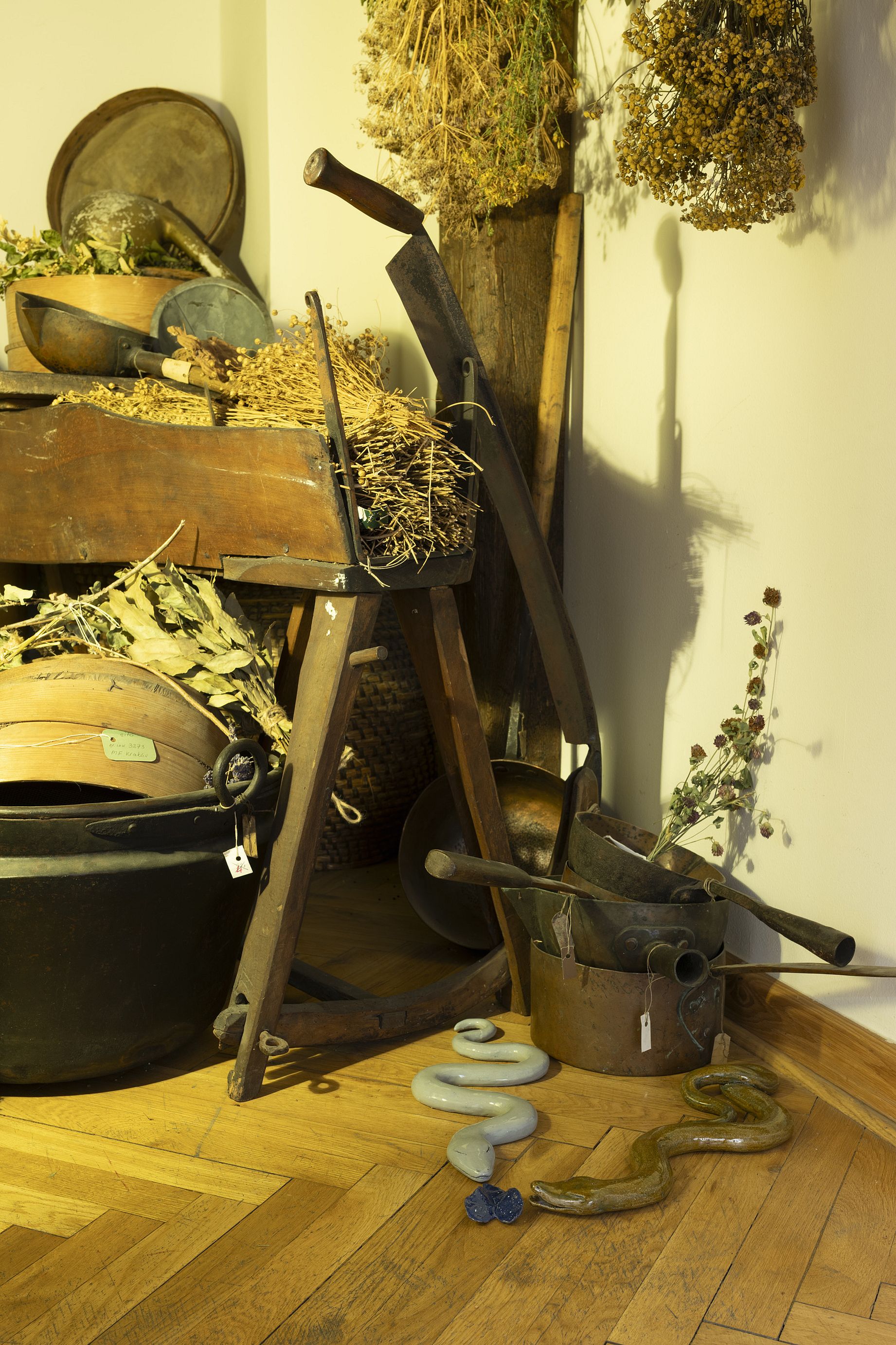 Mit natomiast mówi o tym, jak mag Polyidos odnalazł w labiryncie syna Minosa – Glaukosa - utopionego w słoju z miodem – dla McKenny’ego był to synonim grzyba zakonserwowanego w miodzie. Próbując ożywić chłopca, mag dostrzega, jak martwy wąż zostaje ożywiony przez drugiego gada, który podpełzł do niego z magiczną rośliną. Podpatrując ten mechanizm Polyidos wskrzesza syna Minosa. Dla mnie jest to przede wszystkim opowieść o uczeniu się od natury – o wiedzy wpisanej w jej procesy, w funkcjonowanie lasów czy grzybni. O potrzebie uważnej obserwacji i odejściu od instrumentalnego traktowania świata pozaludzkiego. W Muzeum część obiektów z tego cyklu – węże oraz maska grzybowego opiekuna lub opiekunki lasu – umieściłam w niewielkiej sali poświęconej tradycji zielarskiej, gdzie ten wątek mógł wybrzmieć najpełniej.