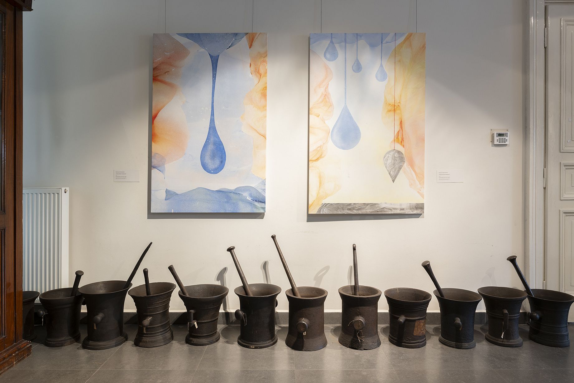 Przyjrzyjmy się samej wystawie. Odbywała się ona we wnętrzu wzorowanym na historycznej aptece z XIX wieku i wypełnionym medycznymi wyrobami oraz narzędziami. Buduje to naukowy charakter miejsca, który został skontrowany przez wasze prace. Szczególnie widać to na przykładzie obrazów Katarzyny („Water pendulum”, „Gravity pendulum”) i obiektów Aleksandry („Mit o Glaukosie”, „Concha”). Możecie o nich trochę opowiedzieć?