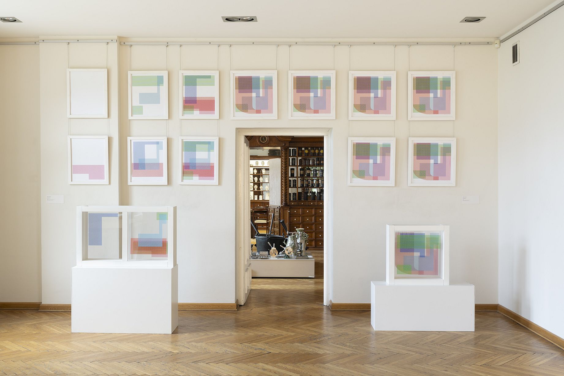 Dodatkowo podczas finisażu prezentowałam swoje interaktywne instalacje multimedialne. Każda z nich opiera się o zestaw podstawowych zasad, na których zbudowane są rastry i łączy je z różnorodnymi przetworzeniami związanymi z czasem, ruchem lub dźwiękiem. Podczas wydarzenia postawiłam sobie za zadanie wpasować tę zupełnie odmienną materię w istniejącą ekspozycję wystawy stałej Muzeum Farmacji.