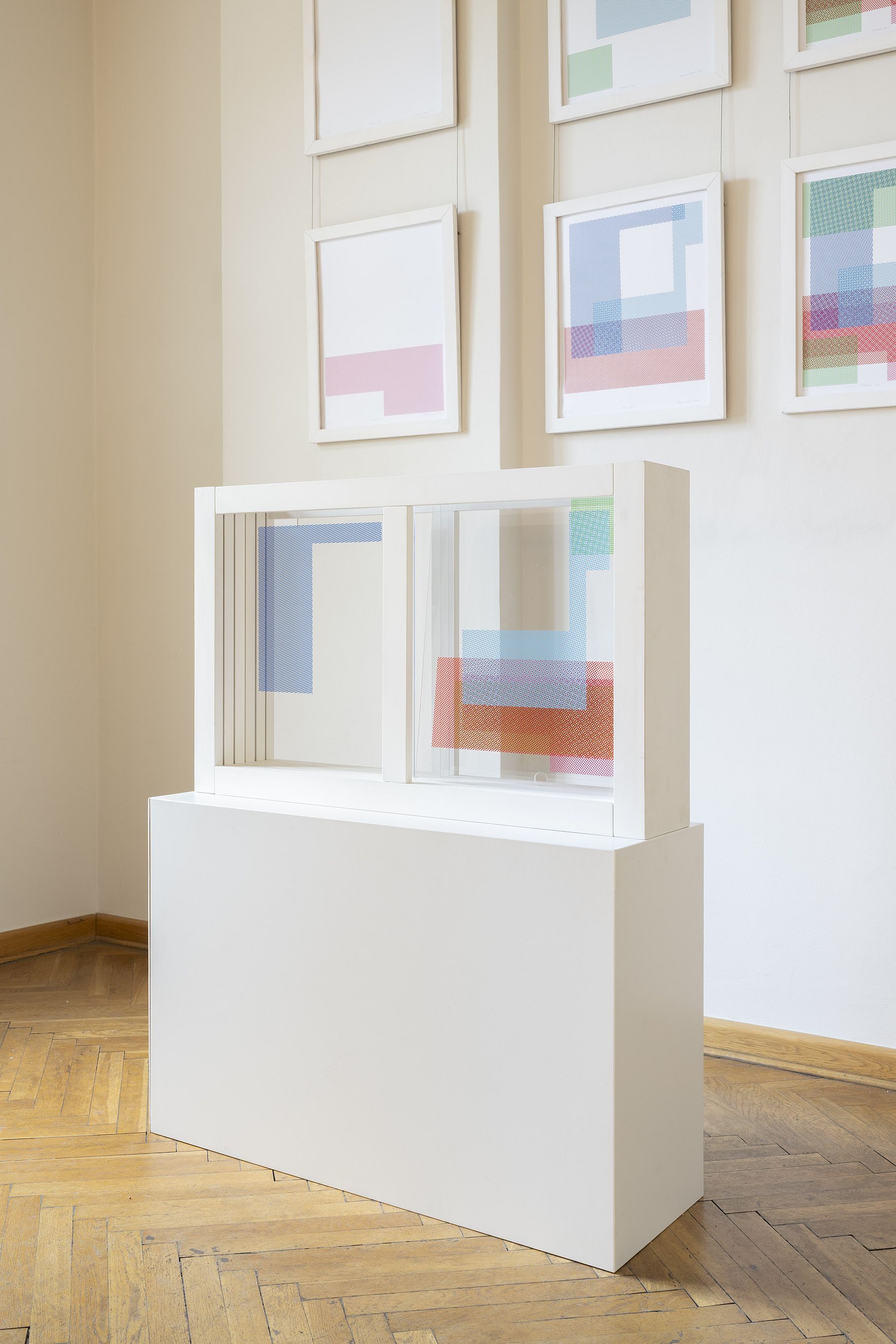 W drugiej serii skupiłam się na sprawdzeniu, jak liczba użytych warstw i ich zakomponowanie wpływa na całą kompozycję. W tym celu wydrukowałam tę samą grafikę z usunięciem każdej możliwej ilości warstw, osiągnęłam więc każdą z dostępnych kombinacji. Dwa obiekty towarzyszące odbitkom umożliwiają szybkie dojście do każdej z tych pozycji. Składają się z tych samych warstw rastrów, co grafiki, ale umieszczone zostały na taflach pleksi. W jednym możemy po prostu zmienić kolejność warstw, jak w pierwszej serii, a w drugim przesuwać pleksi z jednego okna do drugiego i tworzyć dowolne kompozycje z pięciu dostępnych rastrów, jak w drugiej.