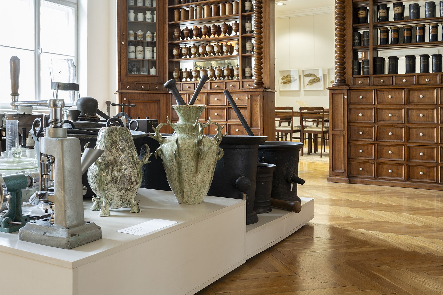 AL: Moje obiekty na wystawie były rozsiane po różnych miejscach w gmachu Muzeum. Przy wyborze kierowałam się tym, co pojawia się w zbiorach od strony formalnej, czyli mnogością ceramicznych naczyń, które służą jako opakowania na substancje lecznicze. Ponadto odwołałam się do samego leczenia. Są to prace pochodzące z dwóch serii. Pierwsza z nich to obiekty z cyklu „Mit o Glaukosie”, a druga - naczynia z cyklu „Concha”. Obie są ze sobą połączone, jak wszystko w mojej praktyce, ale równocześnie są odrębnymi historiami.
